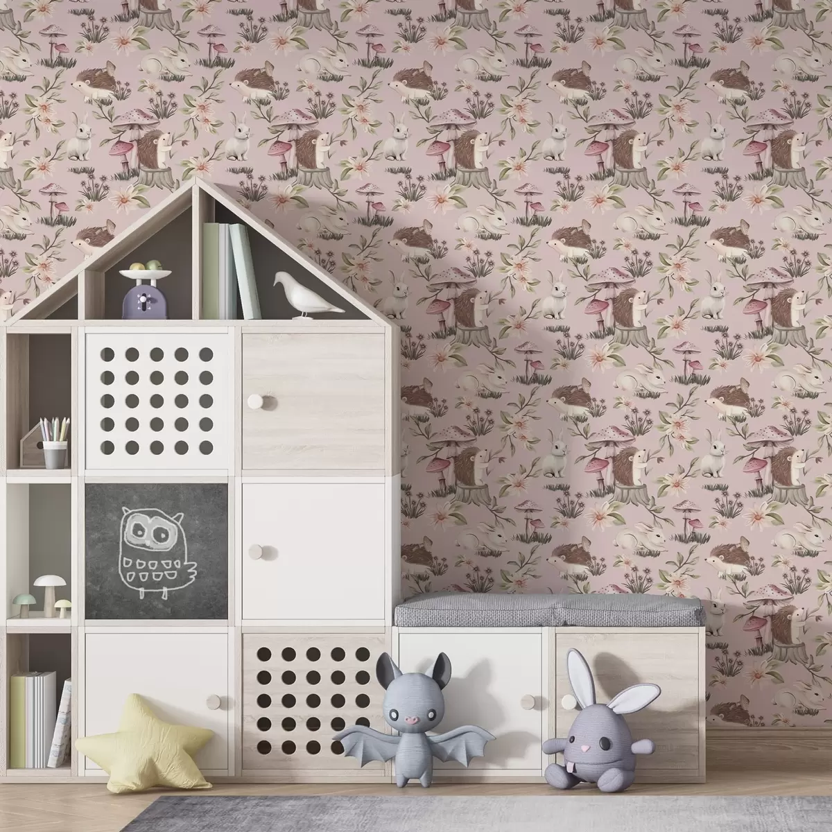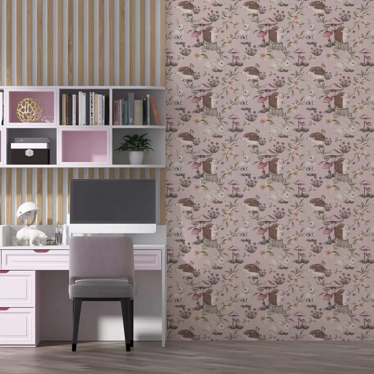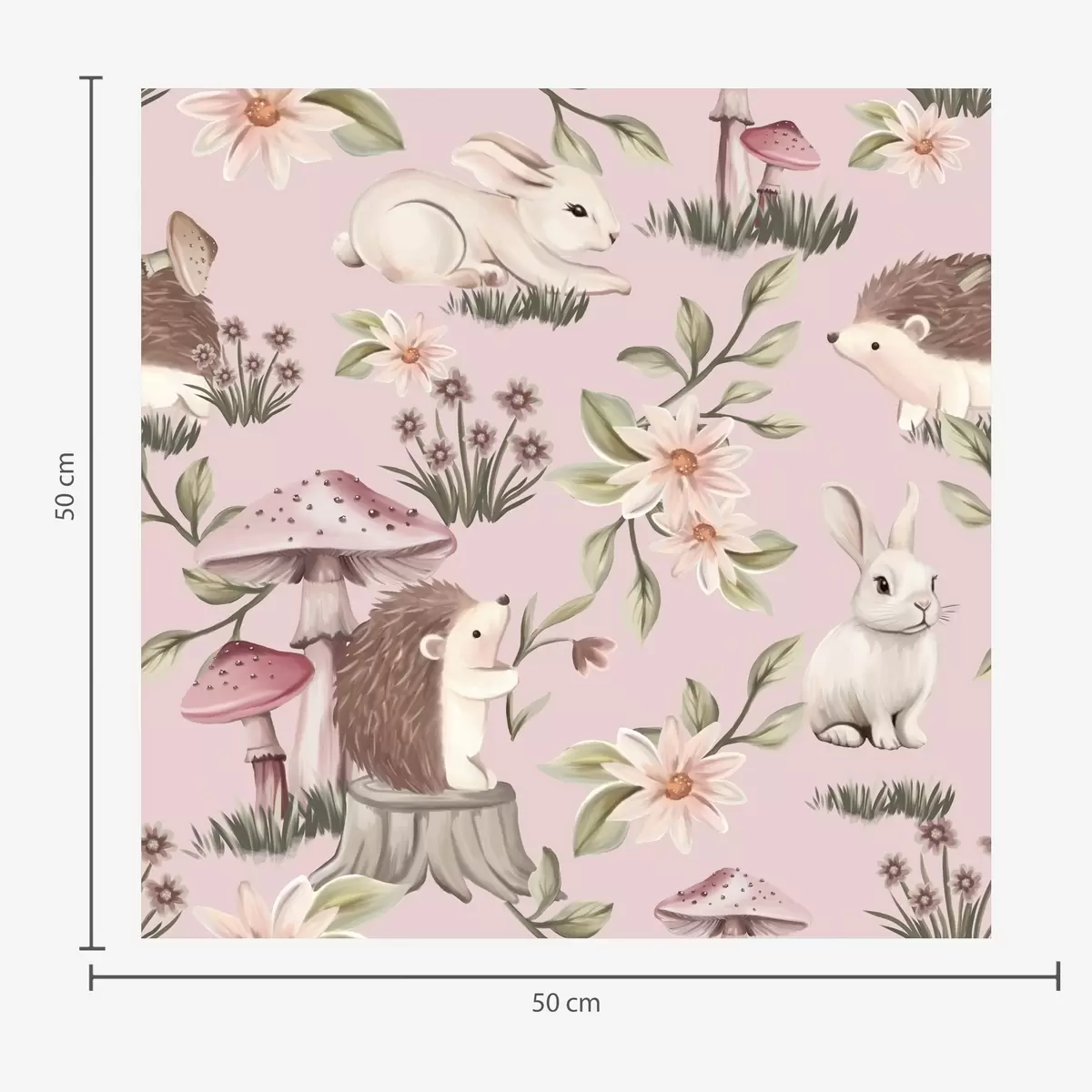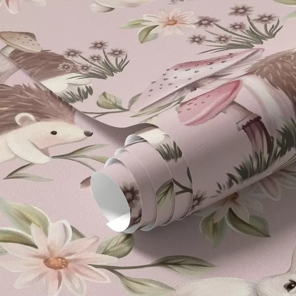 Tapeta Ježci, králíci a květiny v pohádkovém stylu mezi houbami na růžovém pozadí Nr. a00111