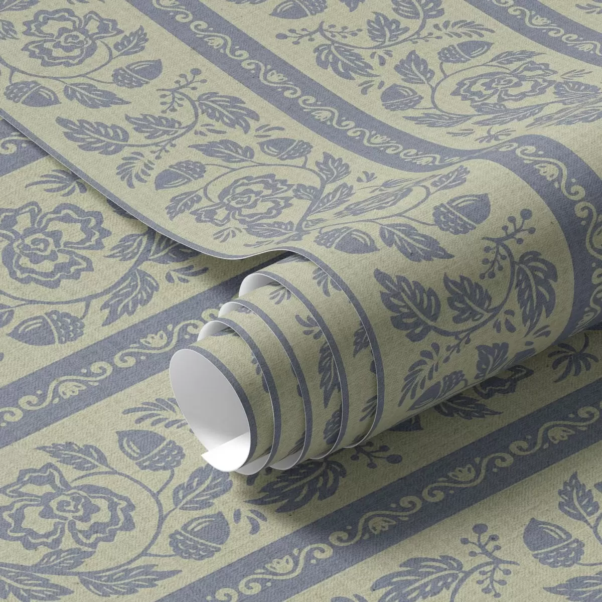 Tapeta Pruhovaný květinový ornament se žaludy v modrých a béžových tónech Nr. a00181