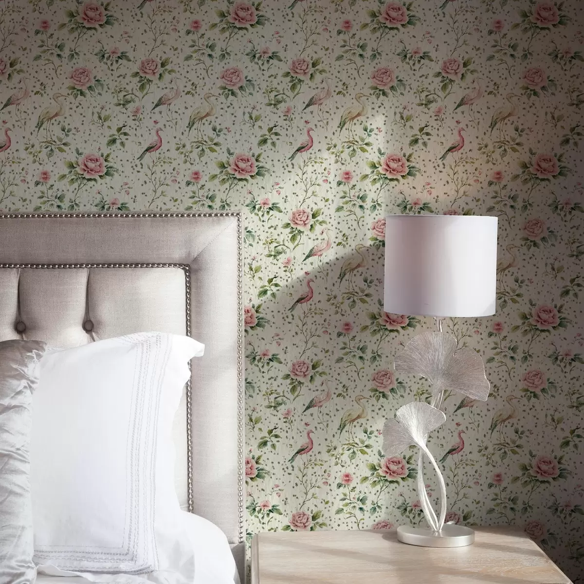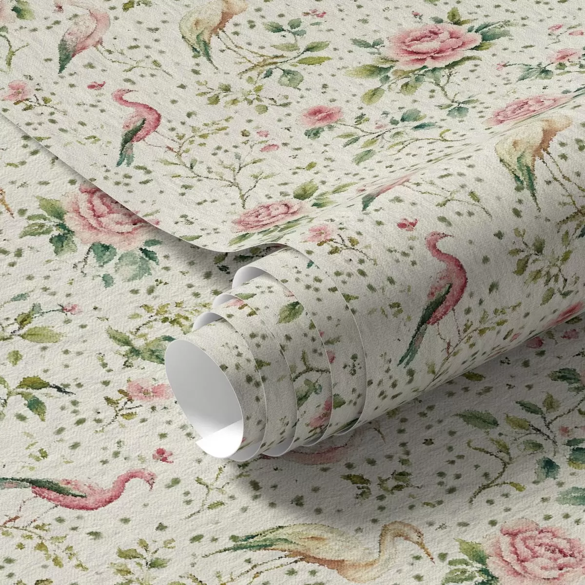 Tapeta Pastelově růžové růže a ptáci v ošuntělém elegantním stylu Nr. a00201