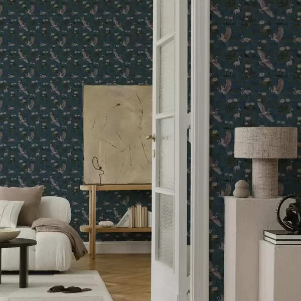 Tapeta Plameňák mezi lekníny, tropická scéna na tmavě modrém pozadí Nr. a00237