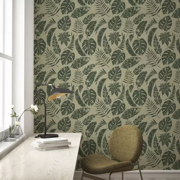 Tapeta Tropické listy ve stylu linorytu, zelené na žlutém podkladu Nr. a00274