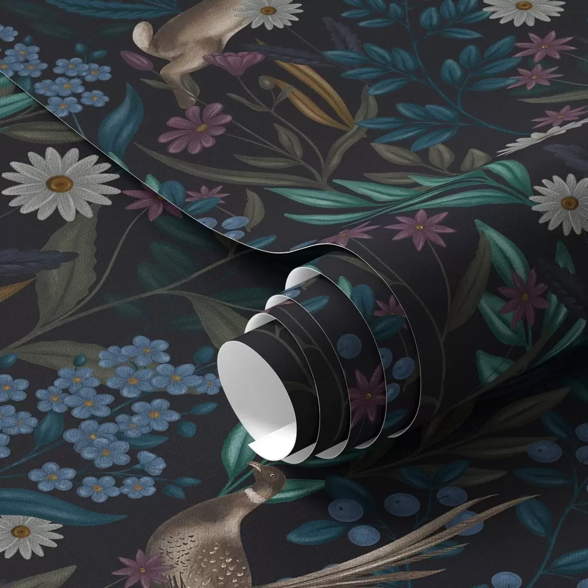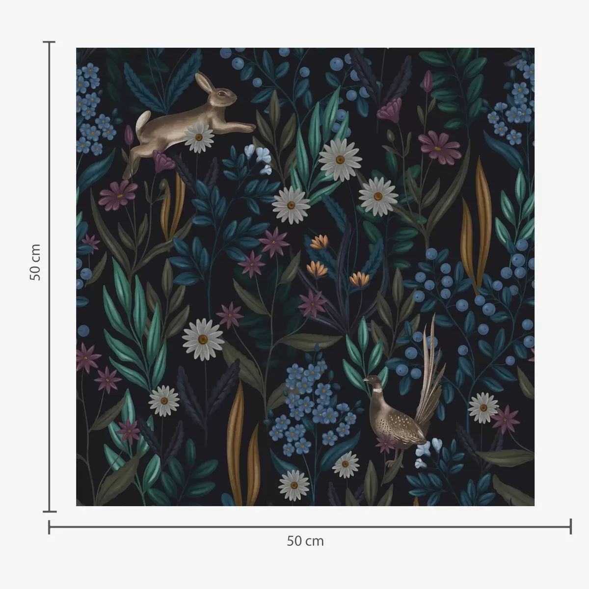 Tapeta Tmavý les s květinami, zajícem a ptákem Nr. a00310