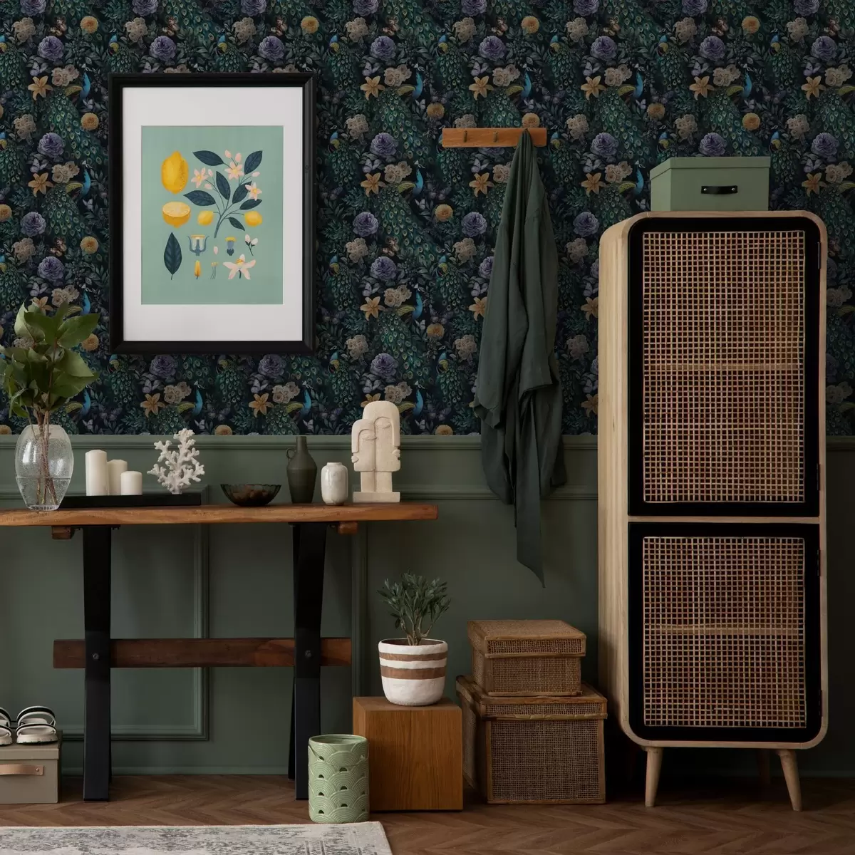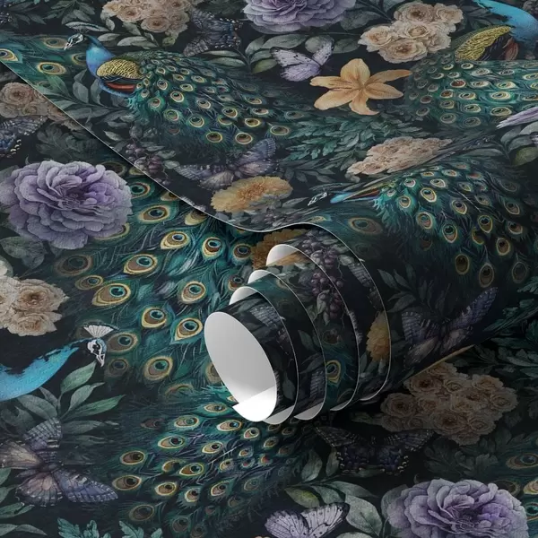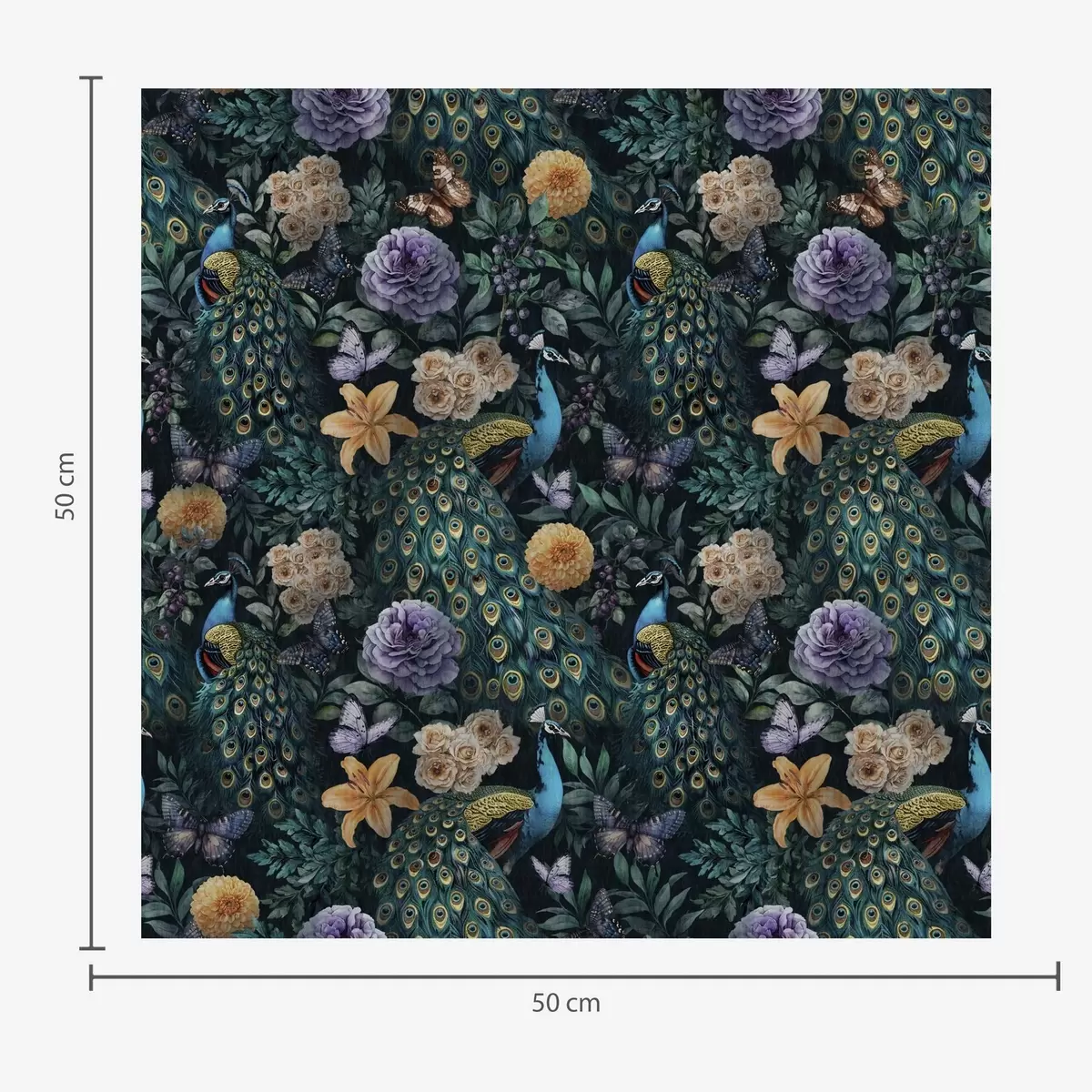 Tapeta Pávi mezi tmavými květy a motýly Nr. a00348