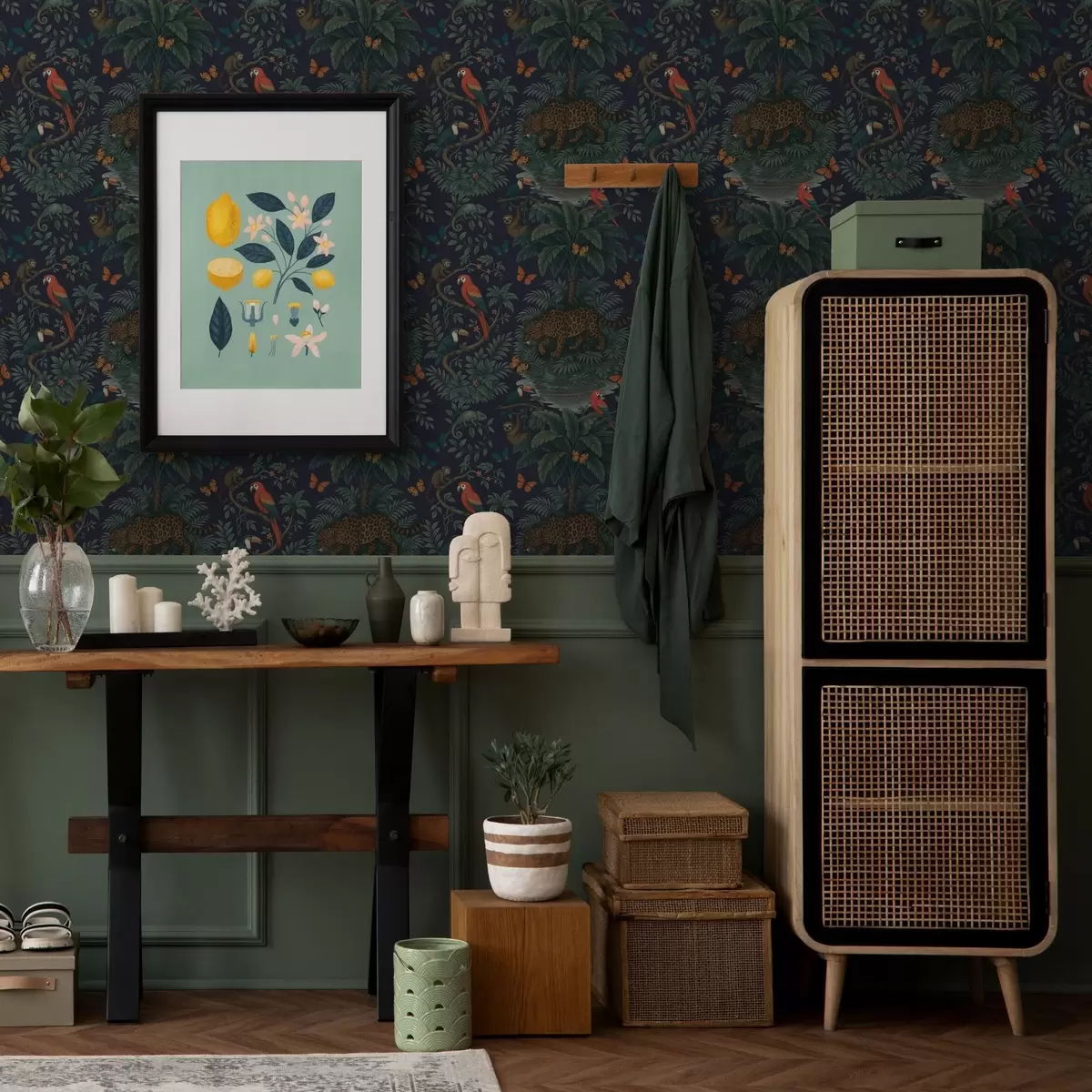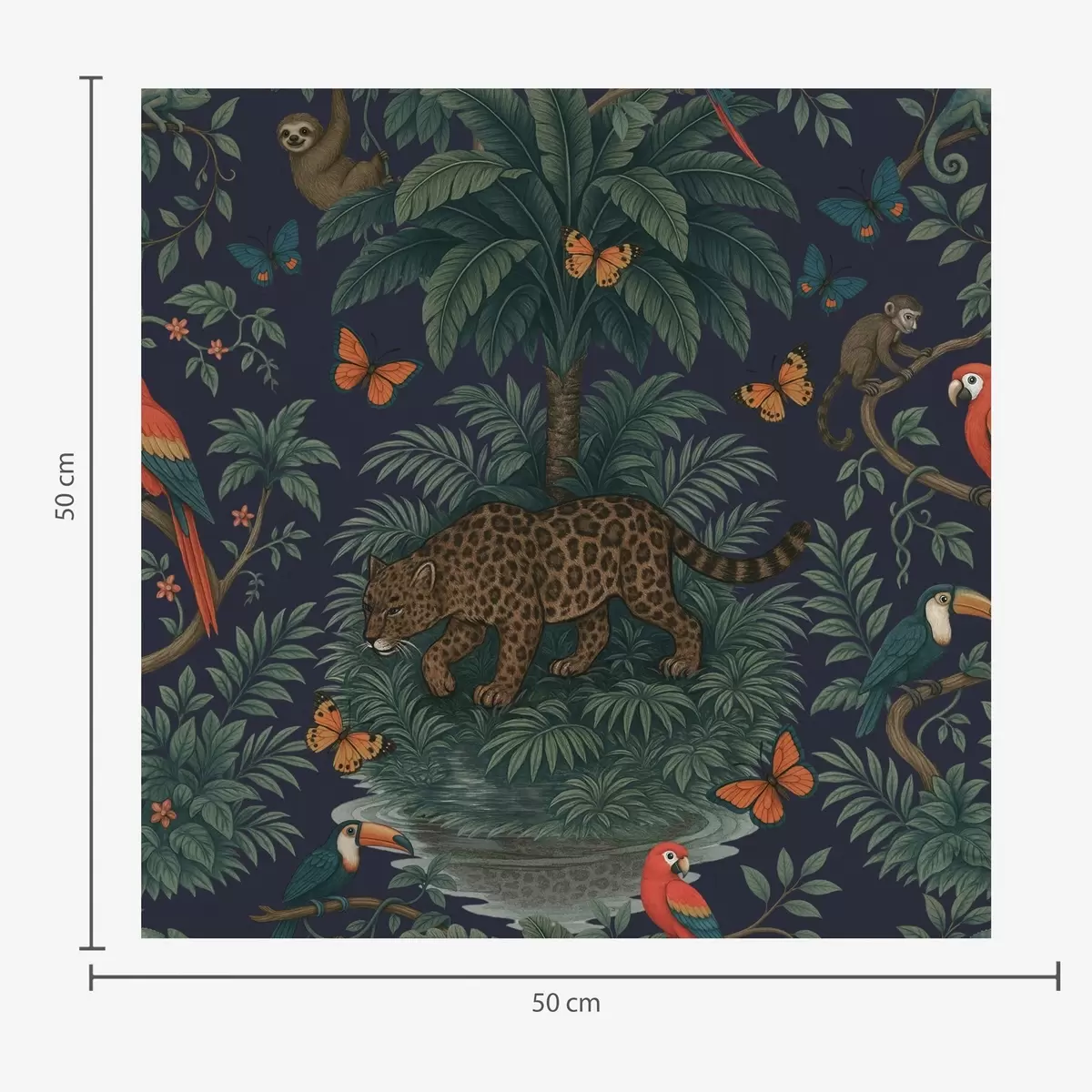 Tapeta Tropická džungle s leopardem, leopardem, papoušky a motýly Nr. a00388