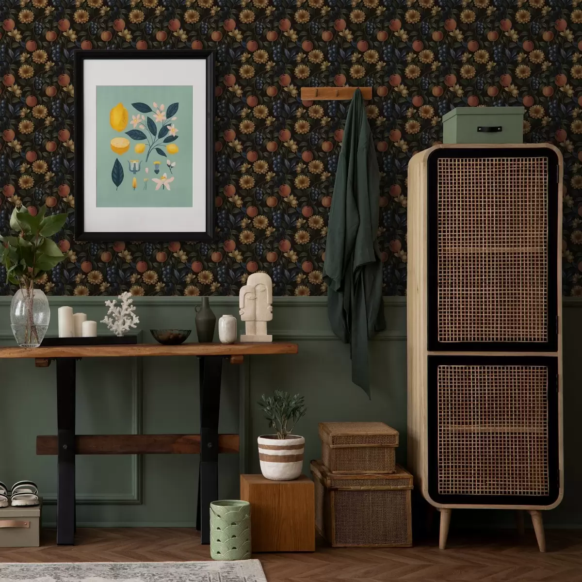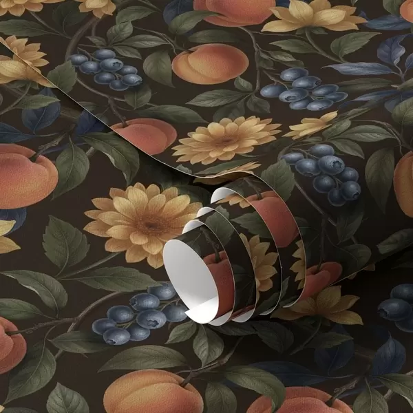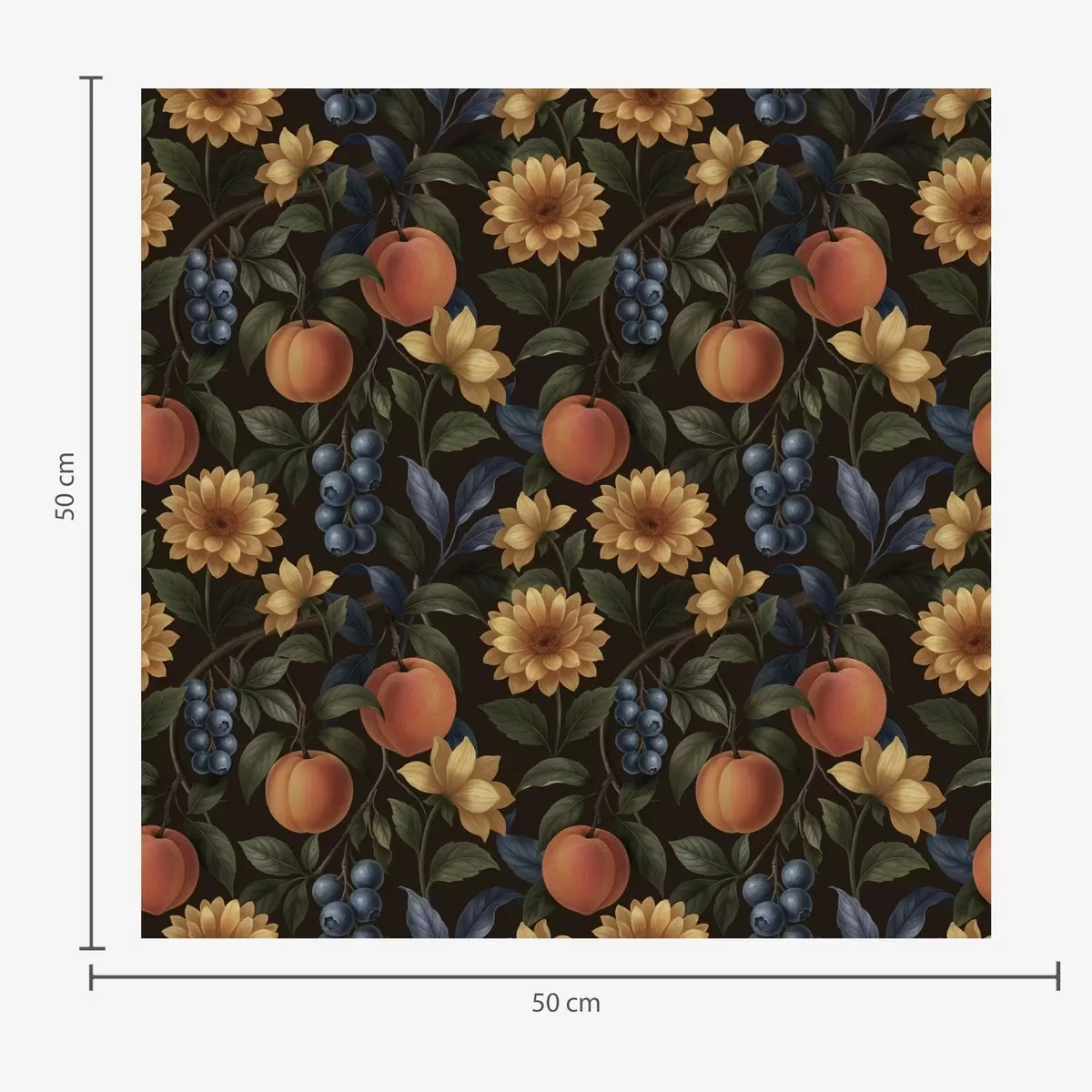 Tapeta Ovoce a žluté květy na tmavém botanickém pozadí Nr. a00395