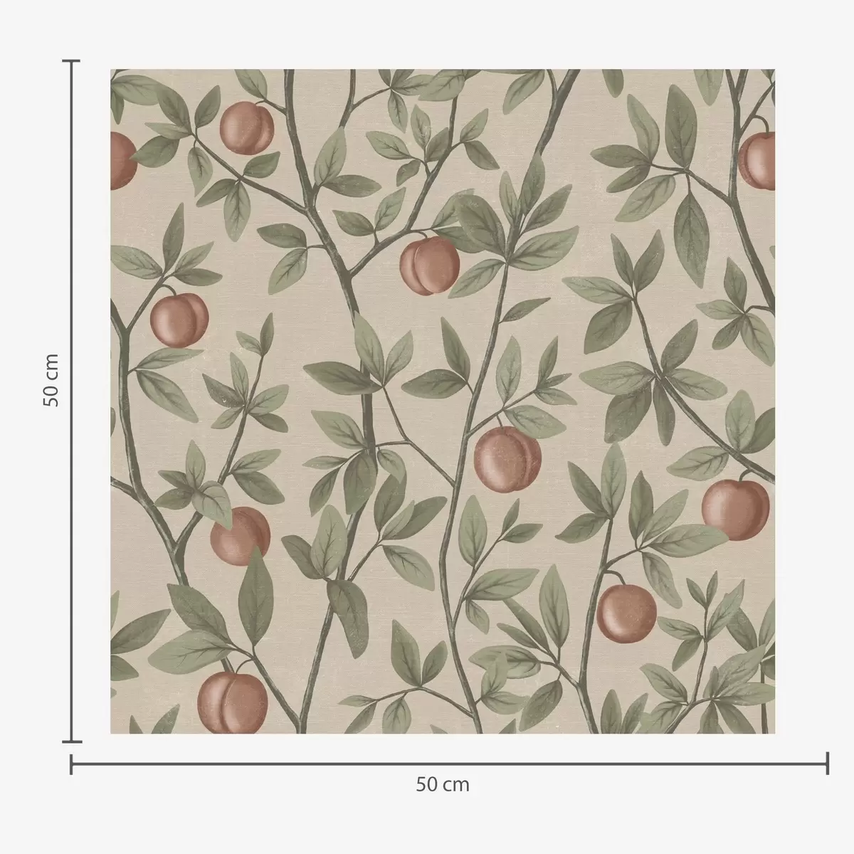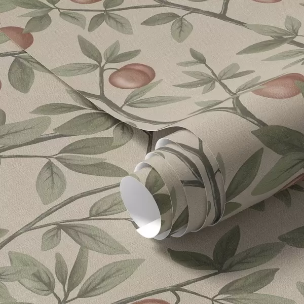Tapeta Broskve na větvích se zelenými listy na béžovém pozadí Nr. a00429