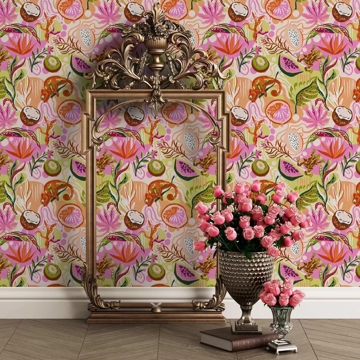 Tapeta Exotické ovoce, listy a chameleoni v tropickém stylu Nr. a00469