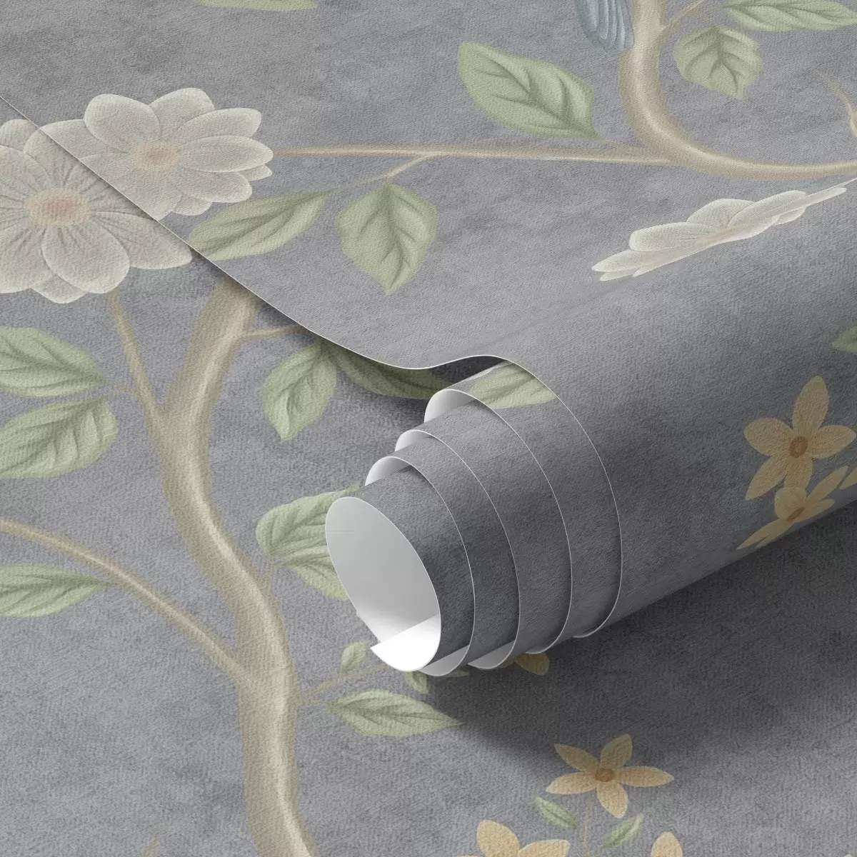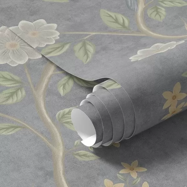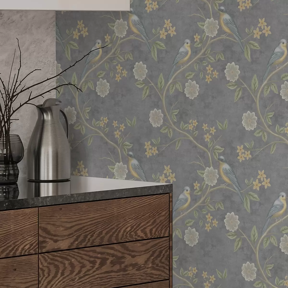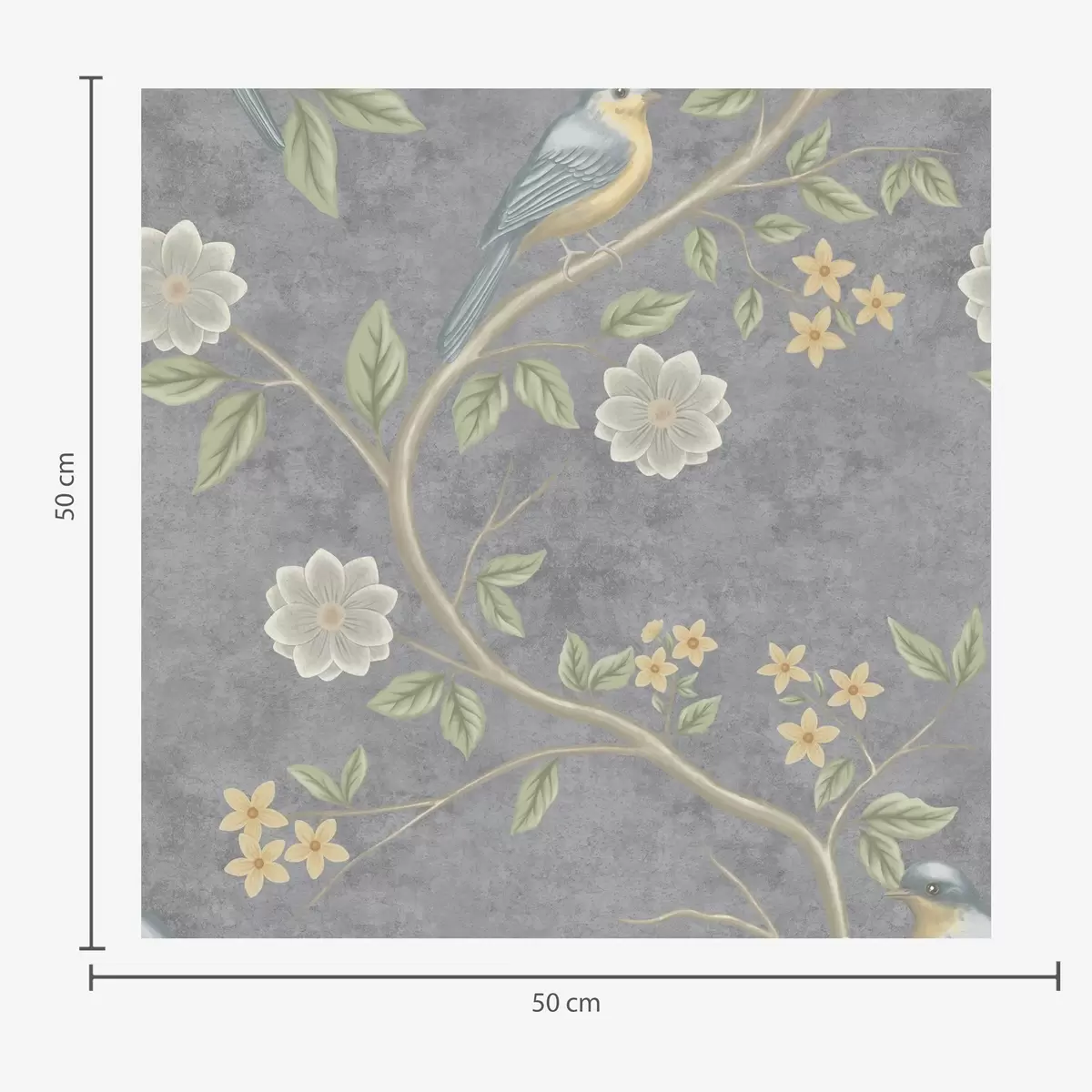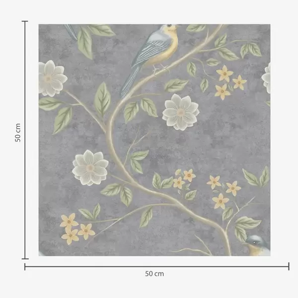Tapeta Ptáci na větvích mezi květinami na šedém pozadí Nr. a00483