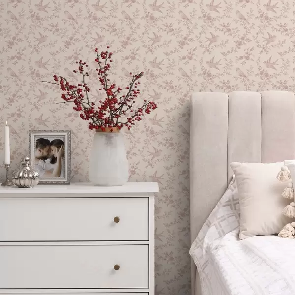 Tapeta Ptáci a růže, vintage vzor na pudrově růžovém podkladu Nr. a00587