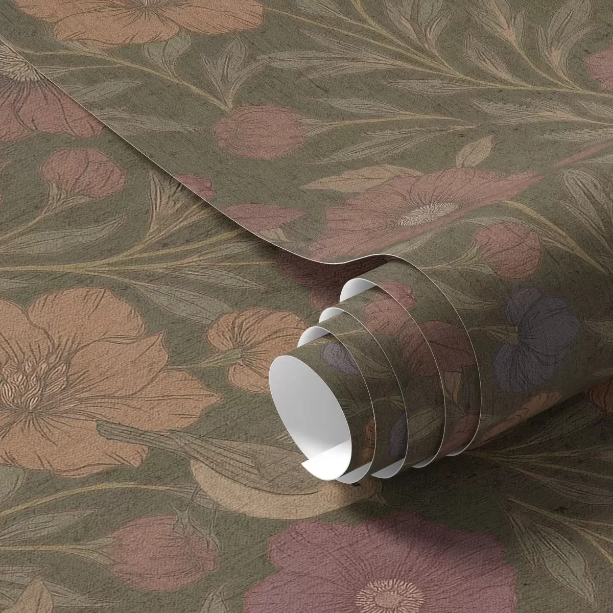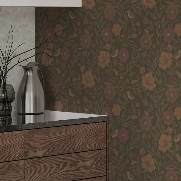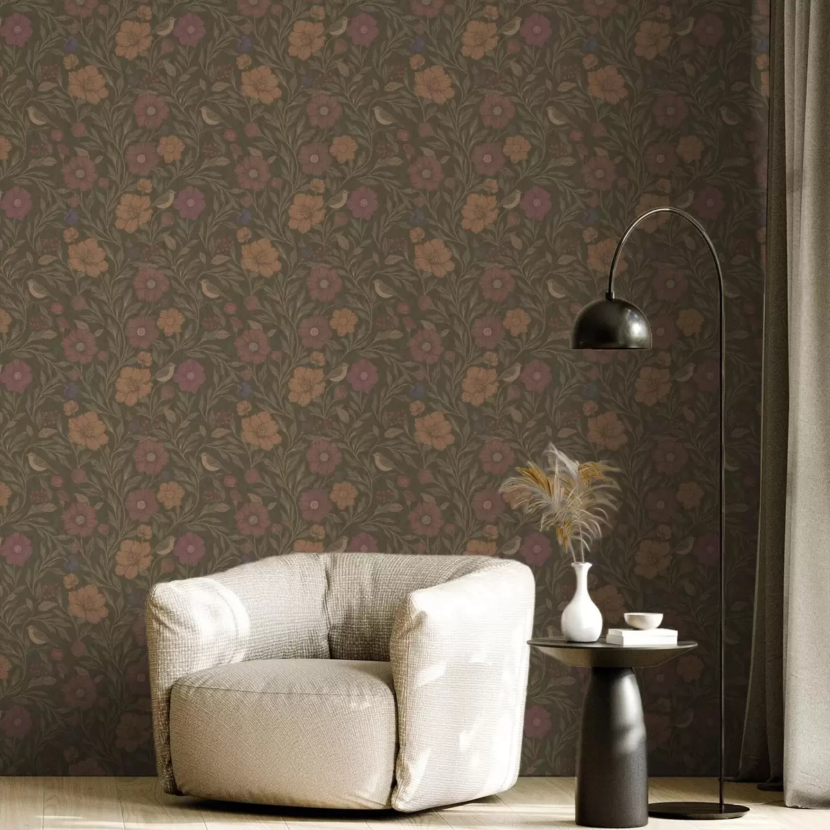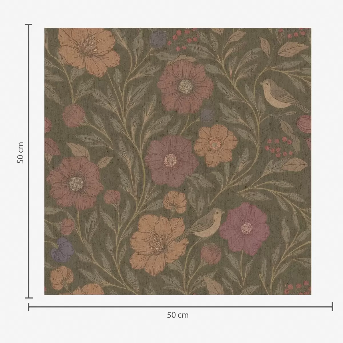 Tapeta Podzimní květiny a ptáci na olivově hnědém pozadí Nr. a00605