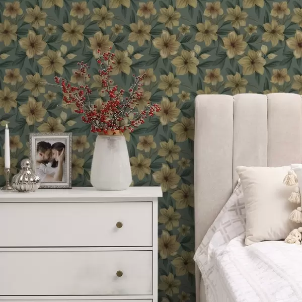 Tapeta Okrové květy na tmavě zeleném pozadí, hustý vzor Nr. a00628