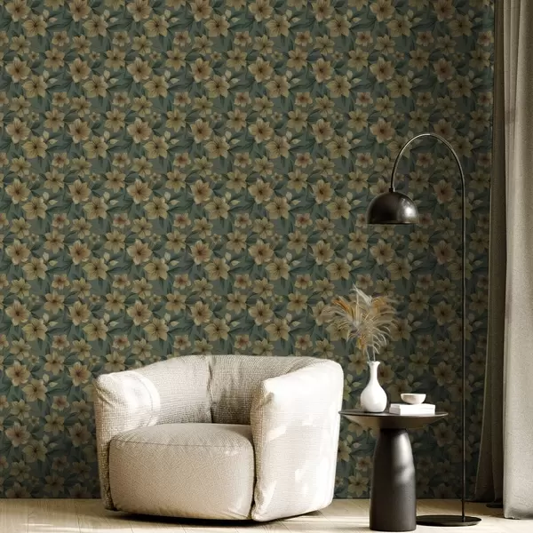 Tapeta Okrové květy na tmavě zeleném pozadí, hustý vzor Nr. a00628