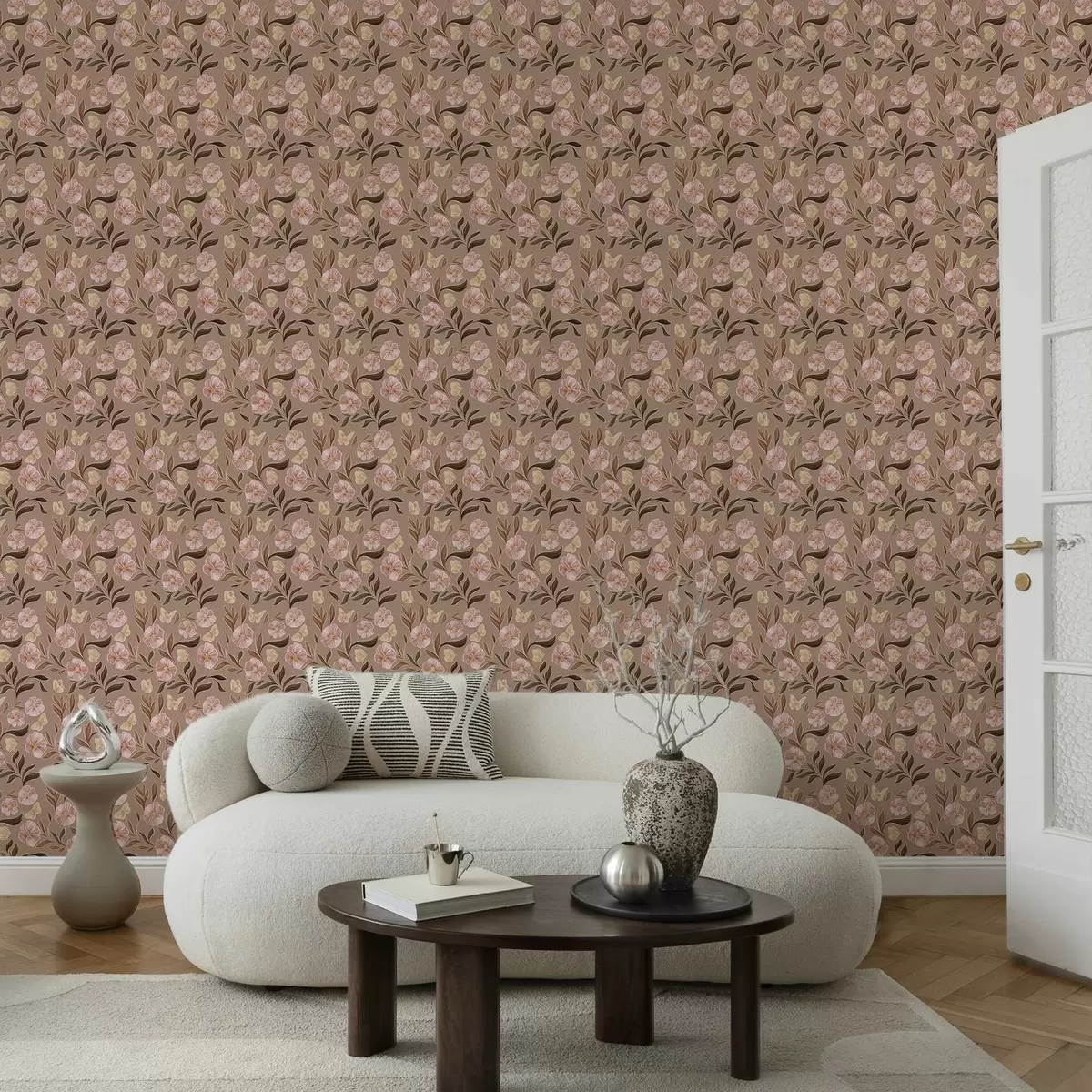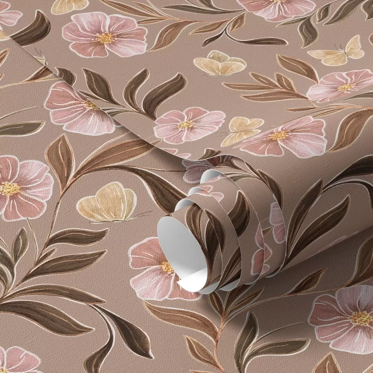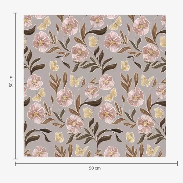 Tapeta Růžové květy a motýli na teplém hnědém pozadí Nr. a00633v1
