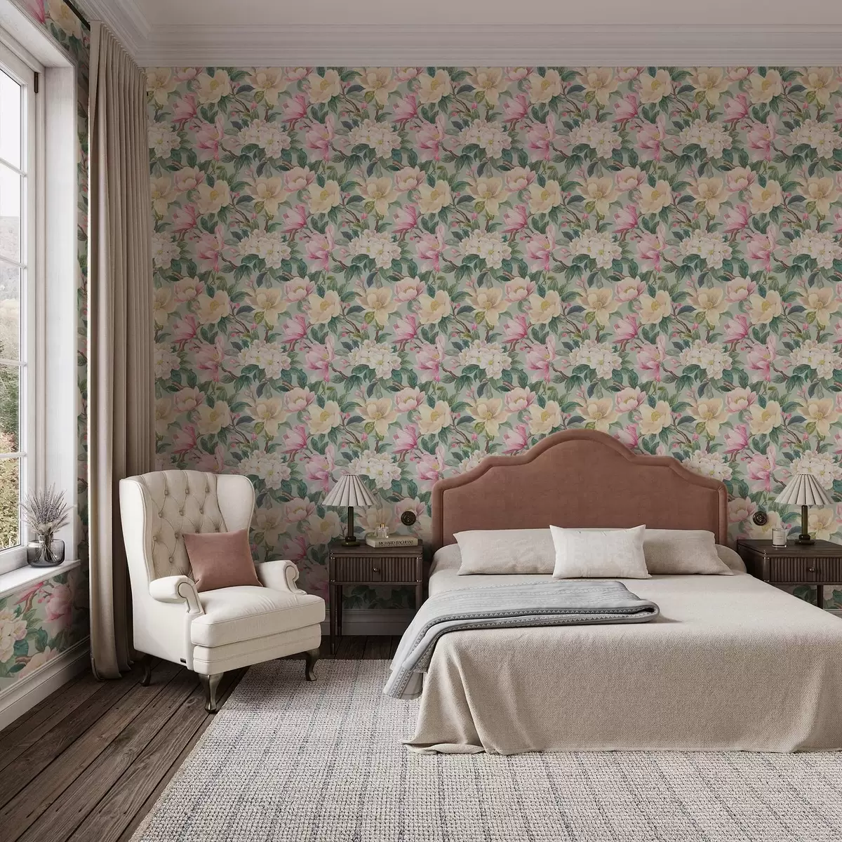 Tapeta Magnólie a bílé květy na mátově šedém pozadí Nr. a00644