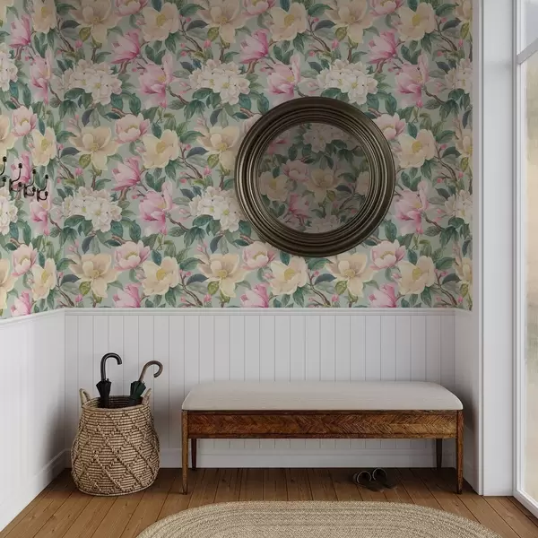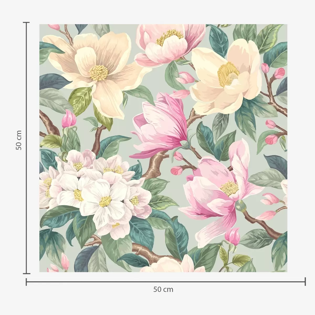 Tapeta Magnólie a bílé květy na mátově šedém pozadí Nr. a00644