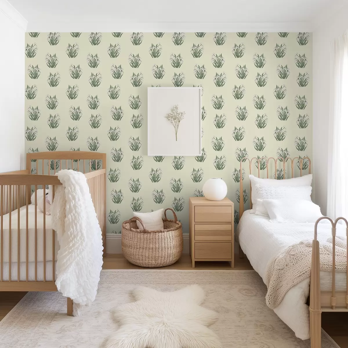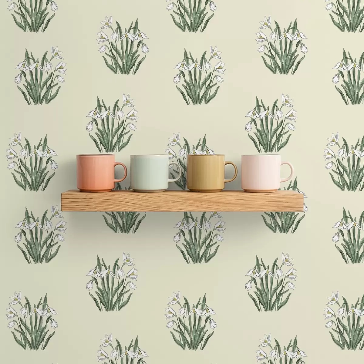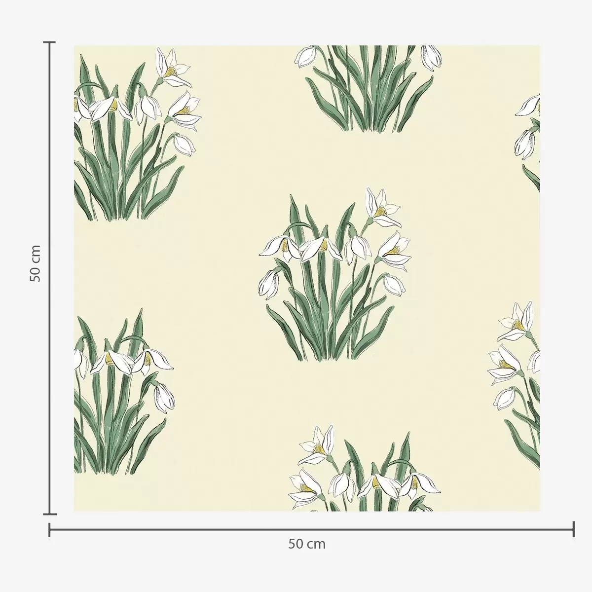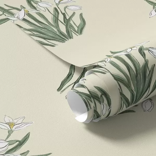 Tapeta Sněženky se zelenými listy na krémovém pozadí Nr. a00651v2