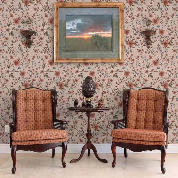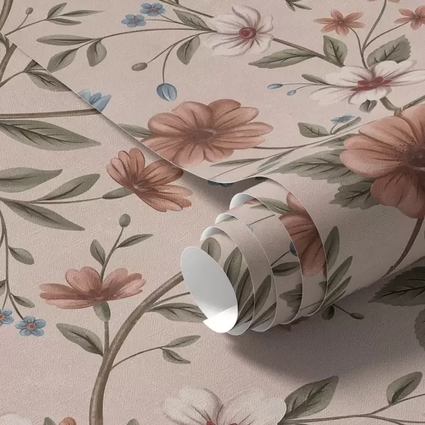 Tapeta Růžovo-korálové květy a listy na prašně růžovém podkladu Nr. a00667