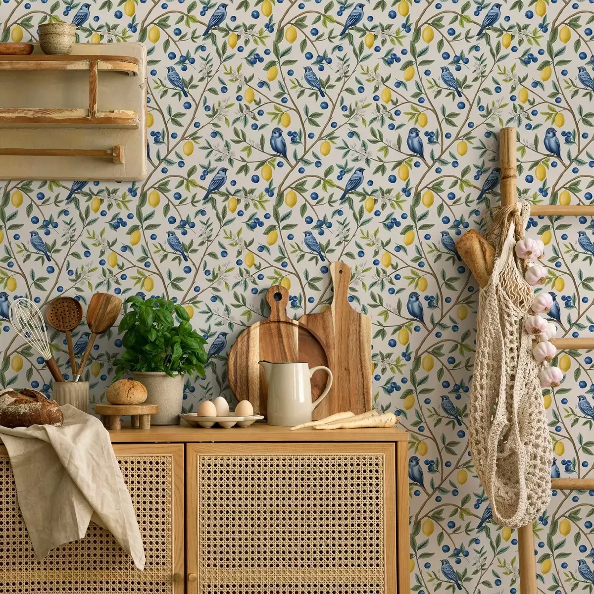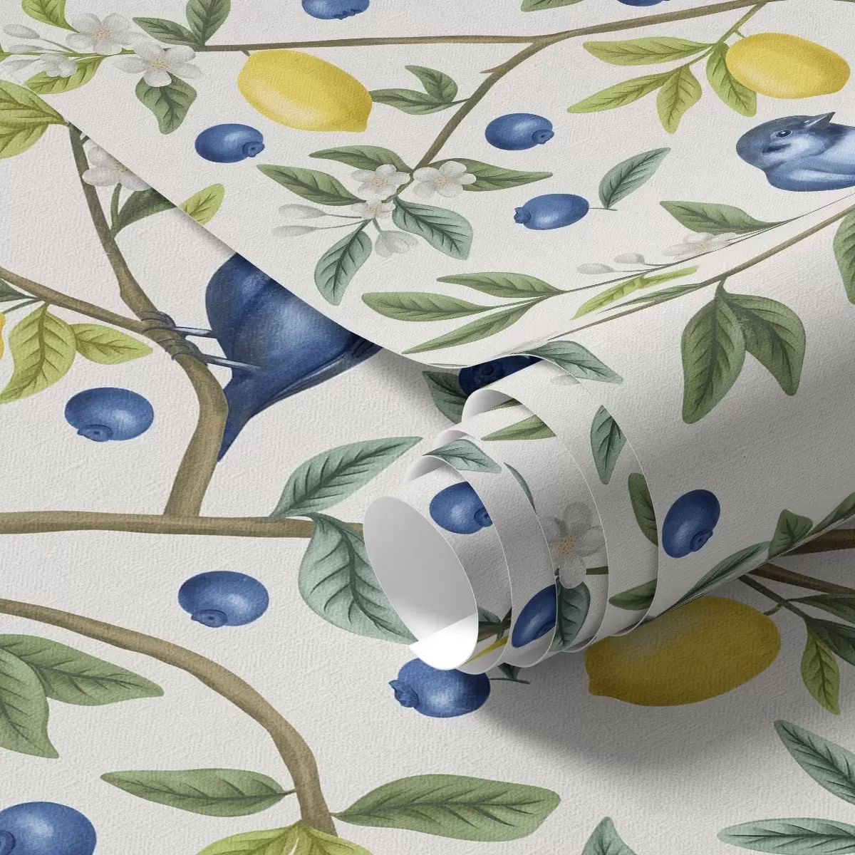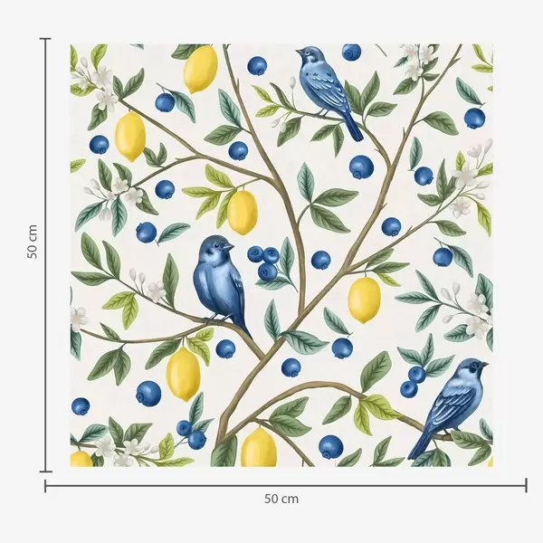 Tapeta Modré ptáky, citrony a bobule na bílém pozadí Nr. a00668