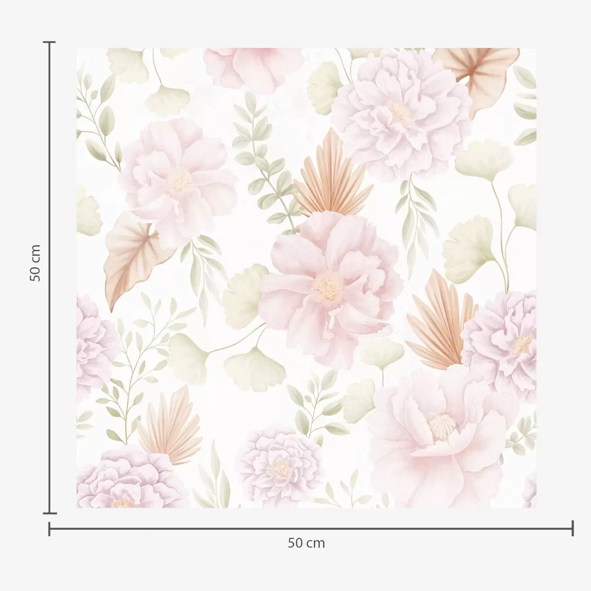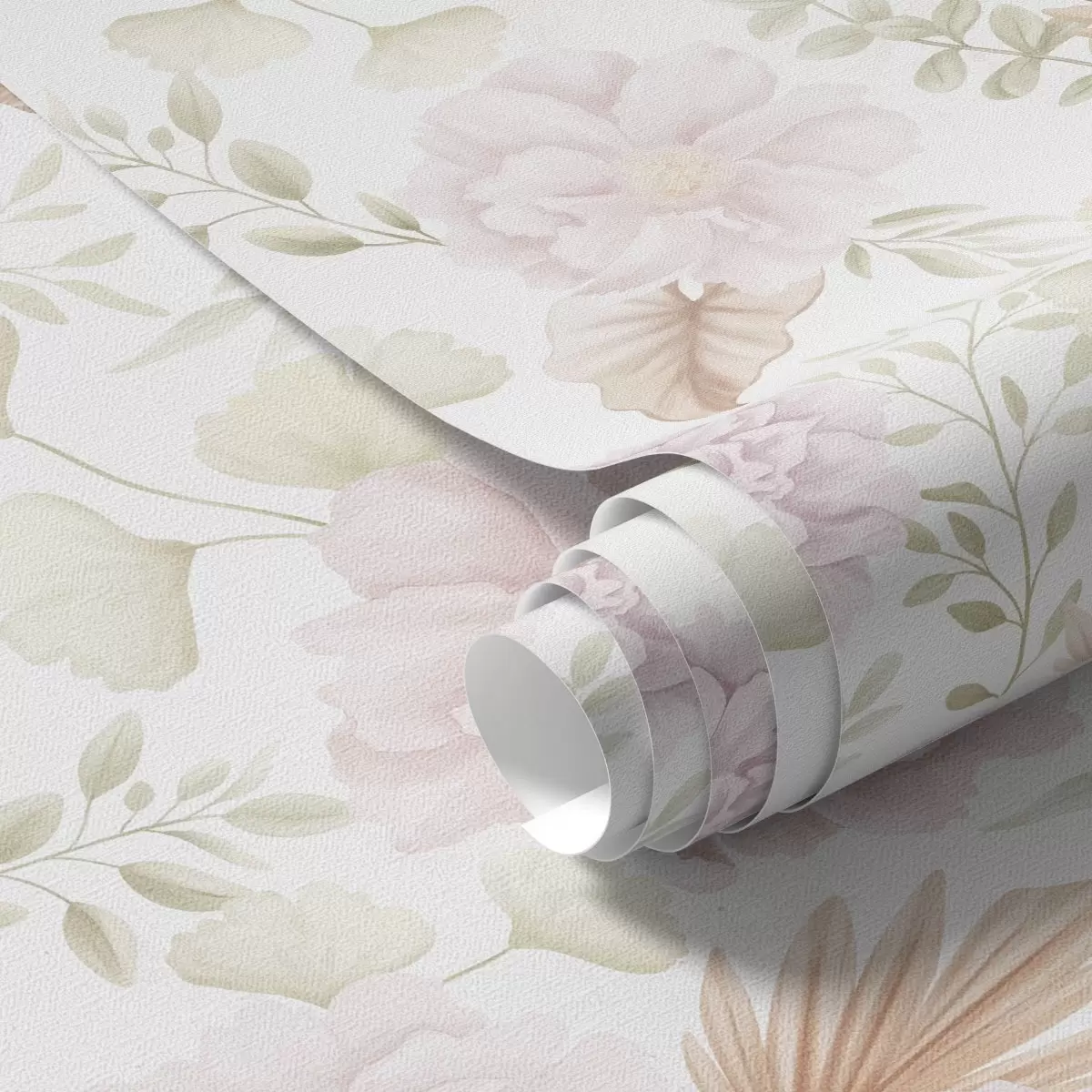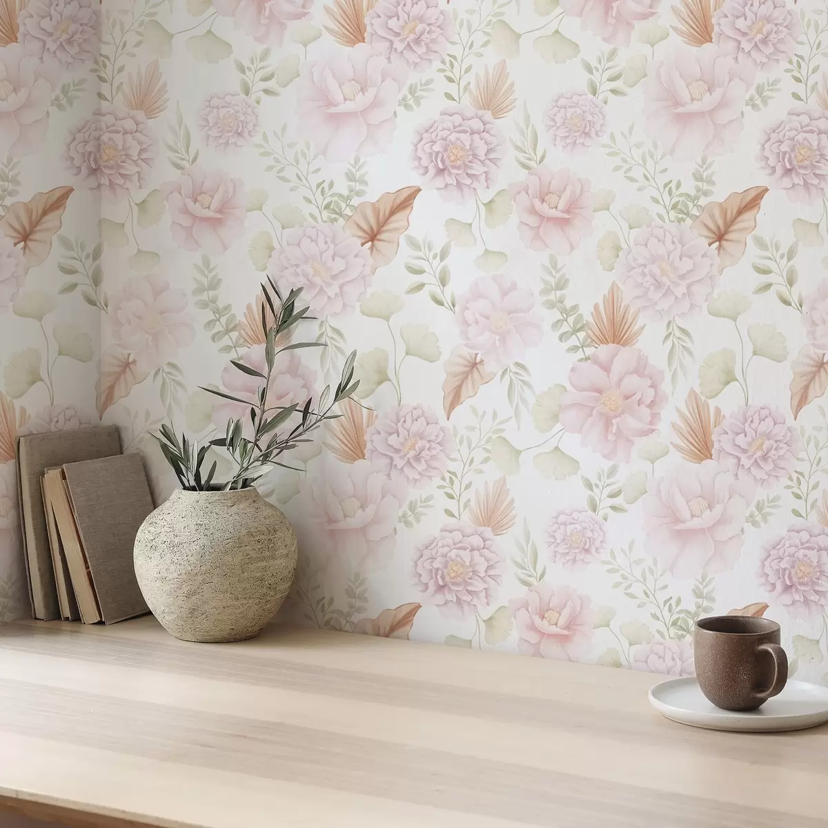 Tapeta Jemné pastelové pivoňky a listy na bílém pozadí Nr. a00669