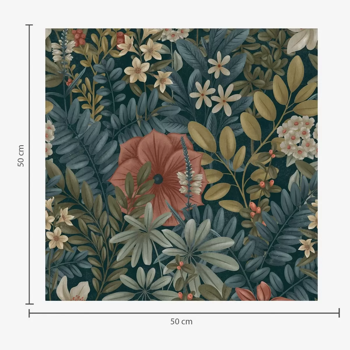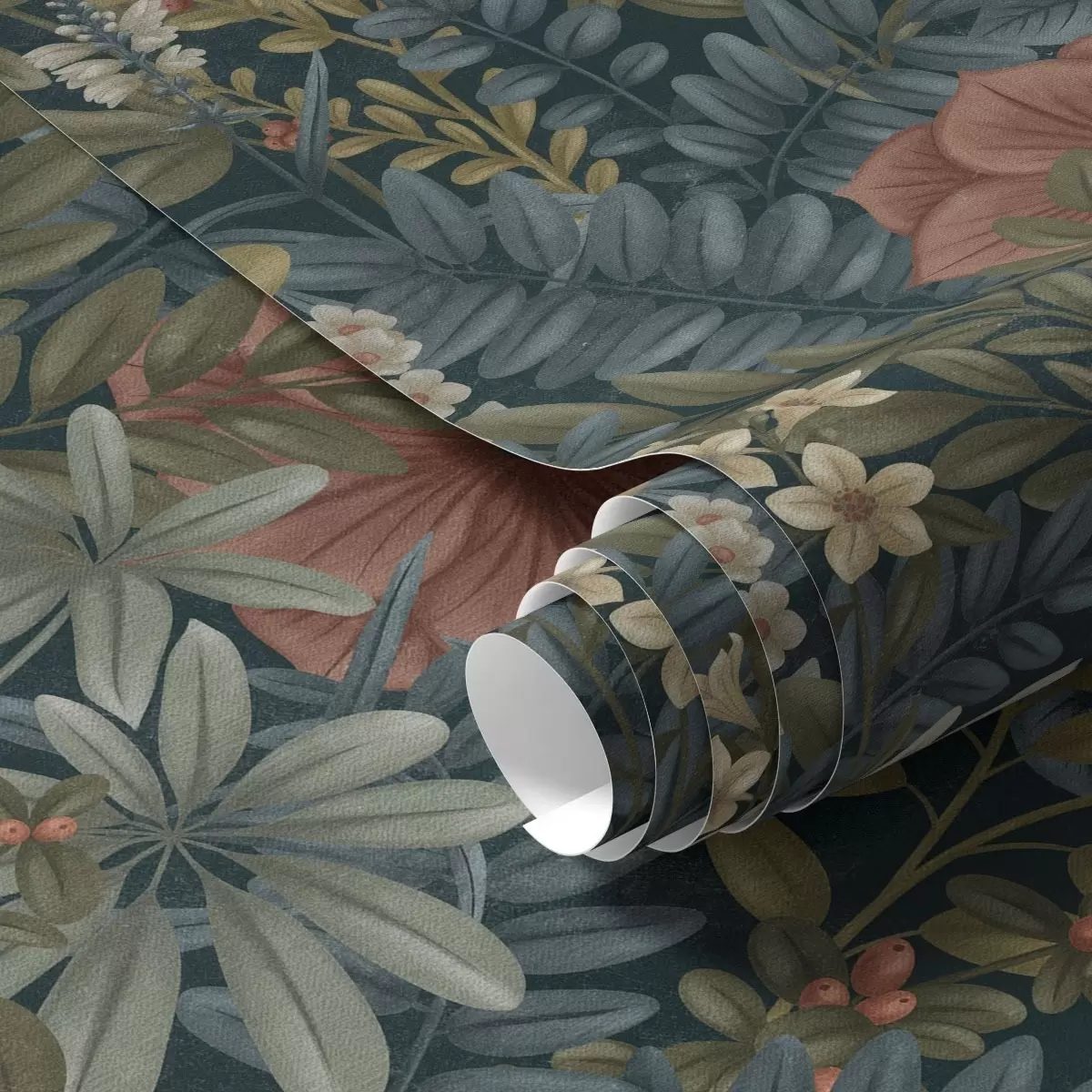 Tapeta Tmavé pozadí s hustými květinami a listy v teplých tónech Nr. a00678