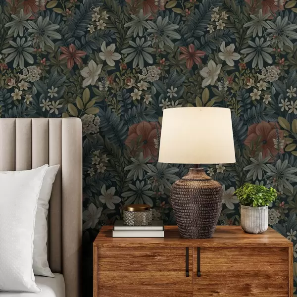 Tapeta Tmavé pozadí s hustými květinami a listy v teplých tónech Nr. a00678