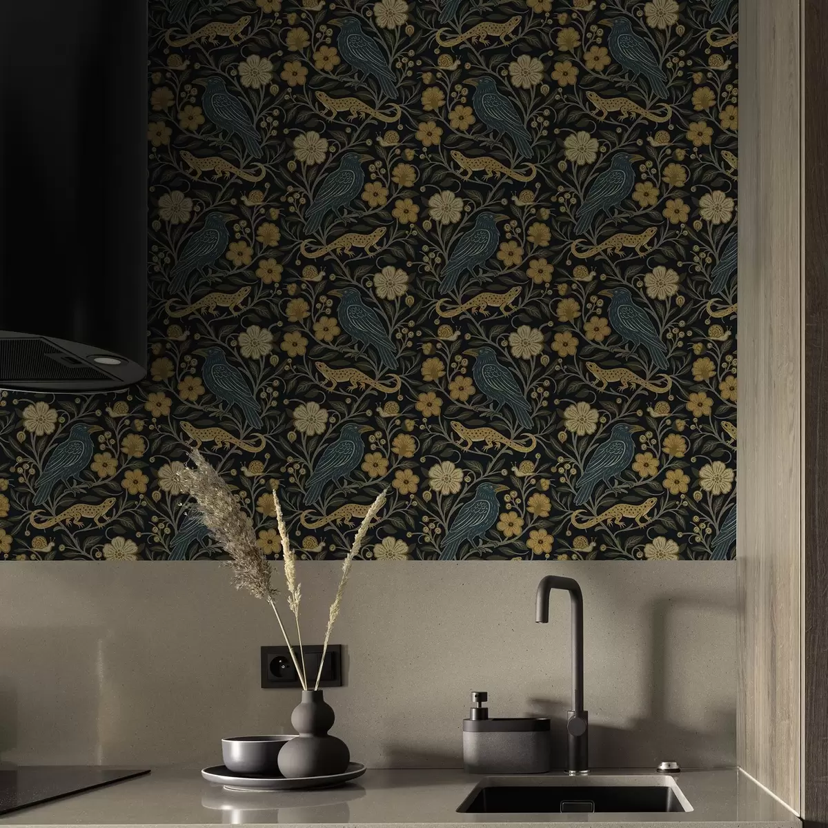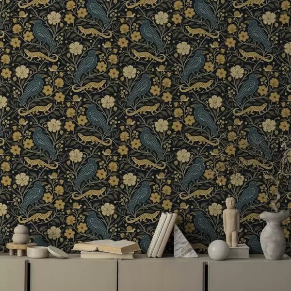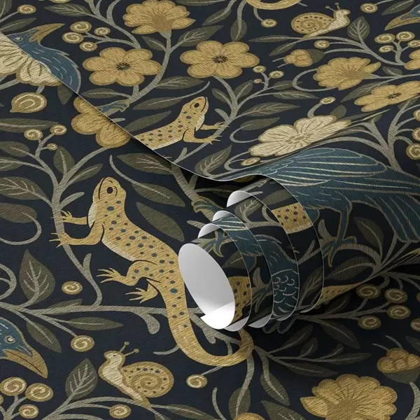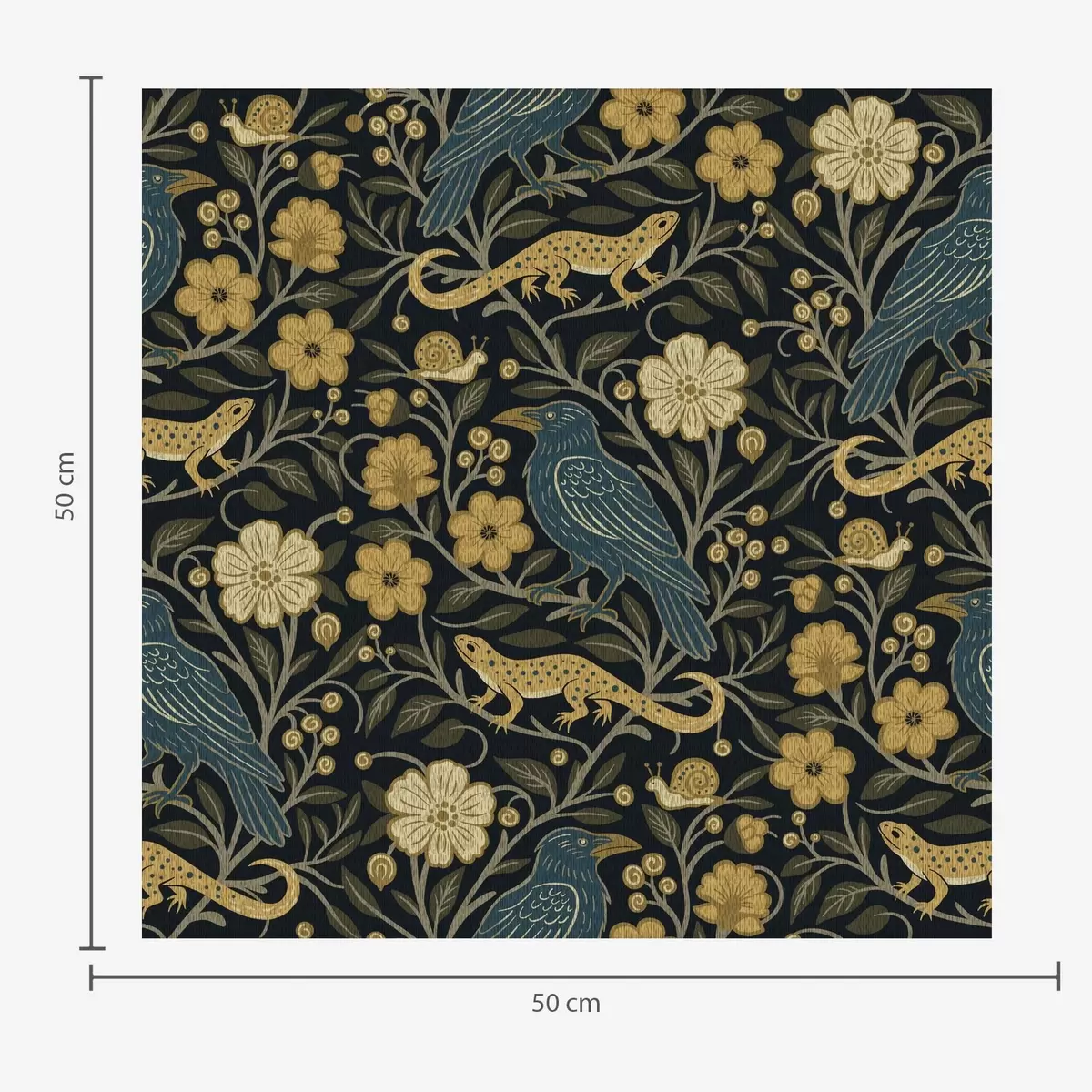 Tapeta Ptáci, ještěrky a šneci mezi květinami na tmavém pozadí Nr. a00691