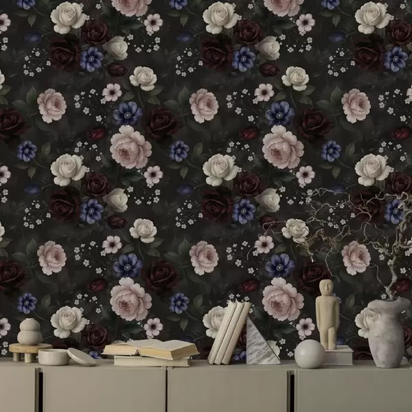Tapeta Tmavé růže, sasanky a pivoňky na tmavém pozadí Nr. a00704