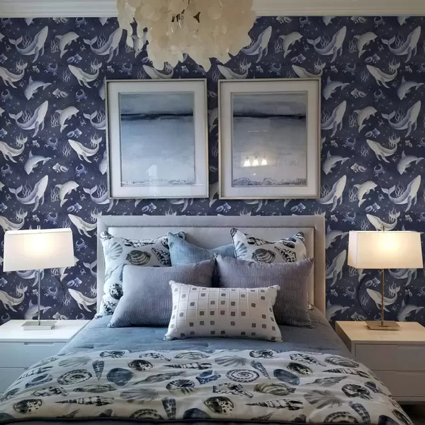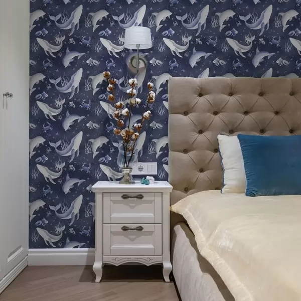 Tapeta Mořské velryby, delfíni a krabi na tmavě modrém pozadí Nr. a00720