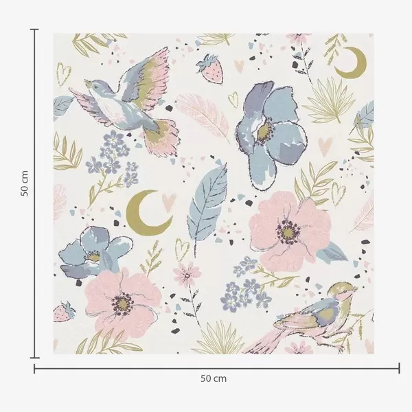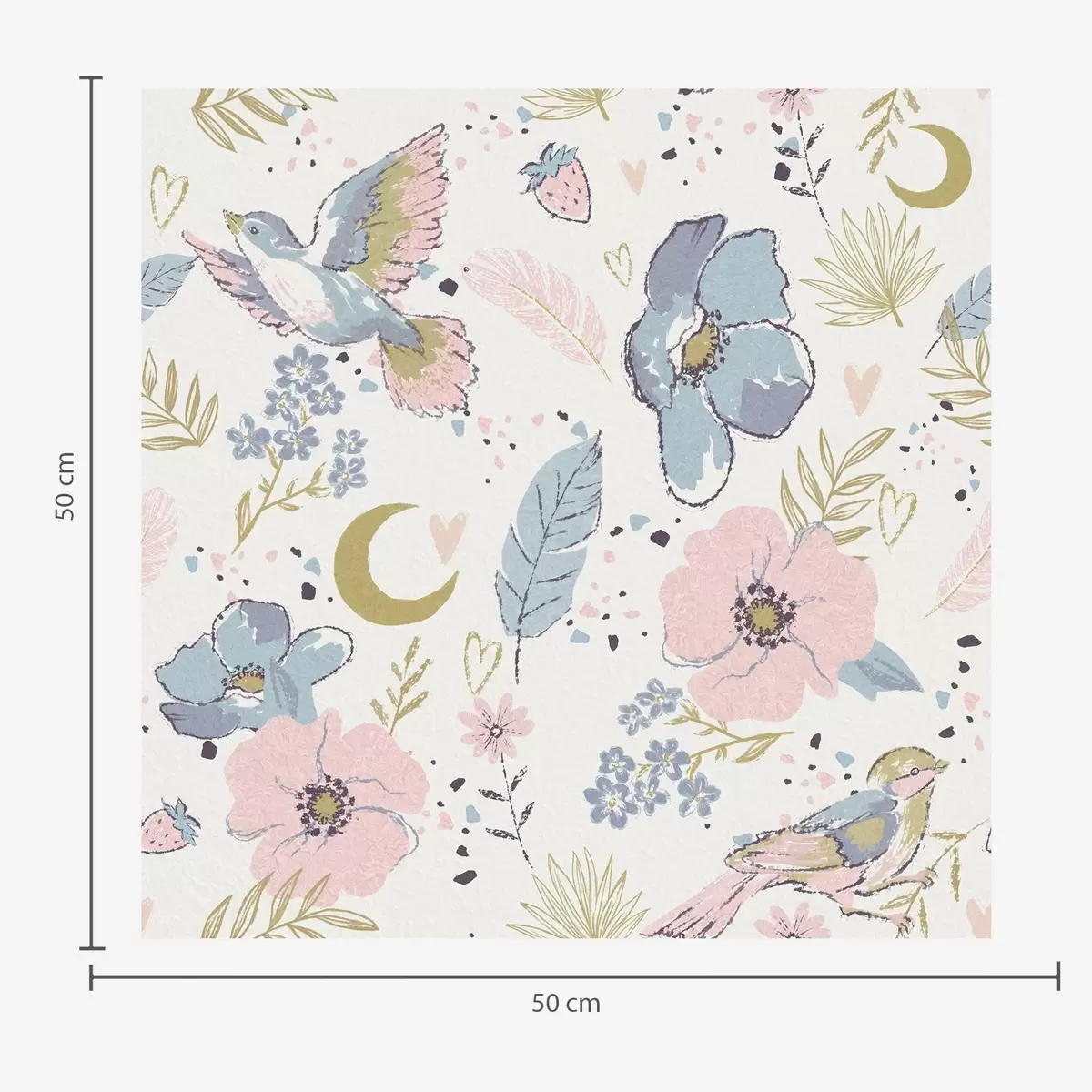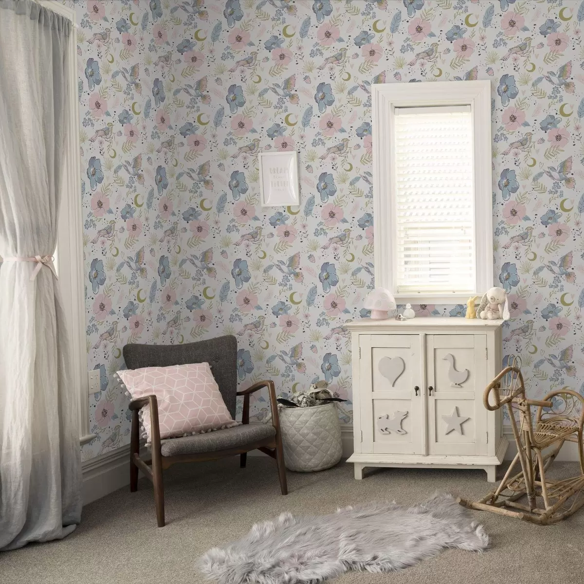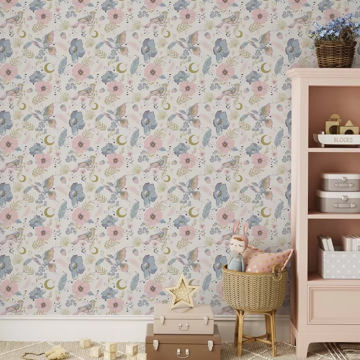 Tapeta Pastelové ptáky a květiny s půlměsíci na bílém pozadí Nr. a00721