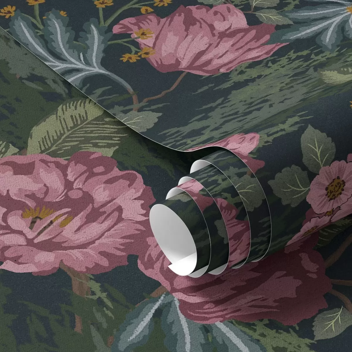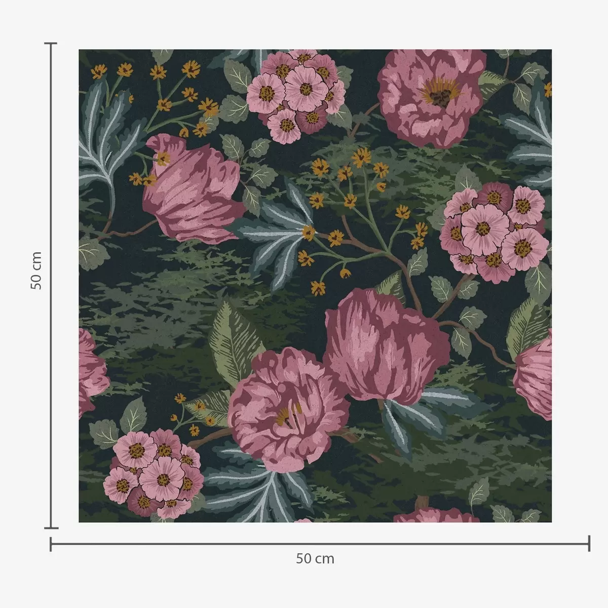 Tapeta Tmavá flóra s růžovými květy a listy, tmavé pozadí Nr. a00724