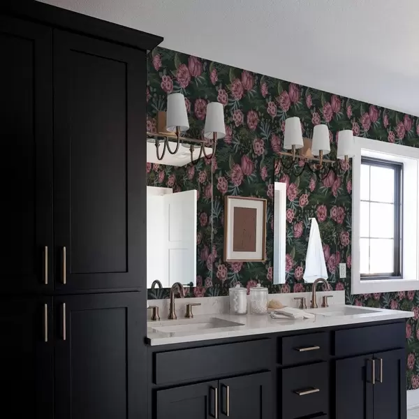 Tapeta Tmavá flóra s růžovými květy a listy, tmavé pozadí Nr. a00724