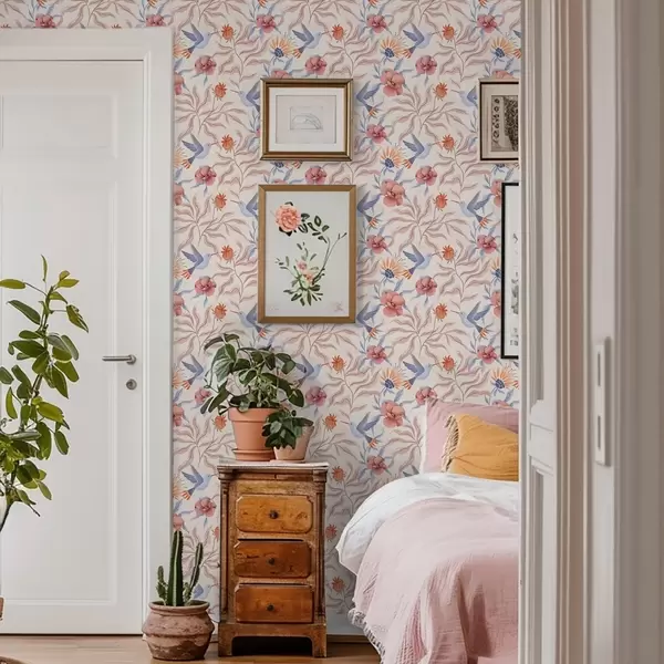 Tapeta Kolibříci mezi velkými květy v růžových a modrých tónech Nr. a00733