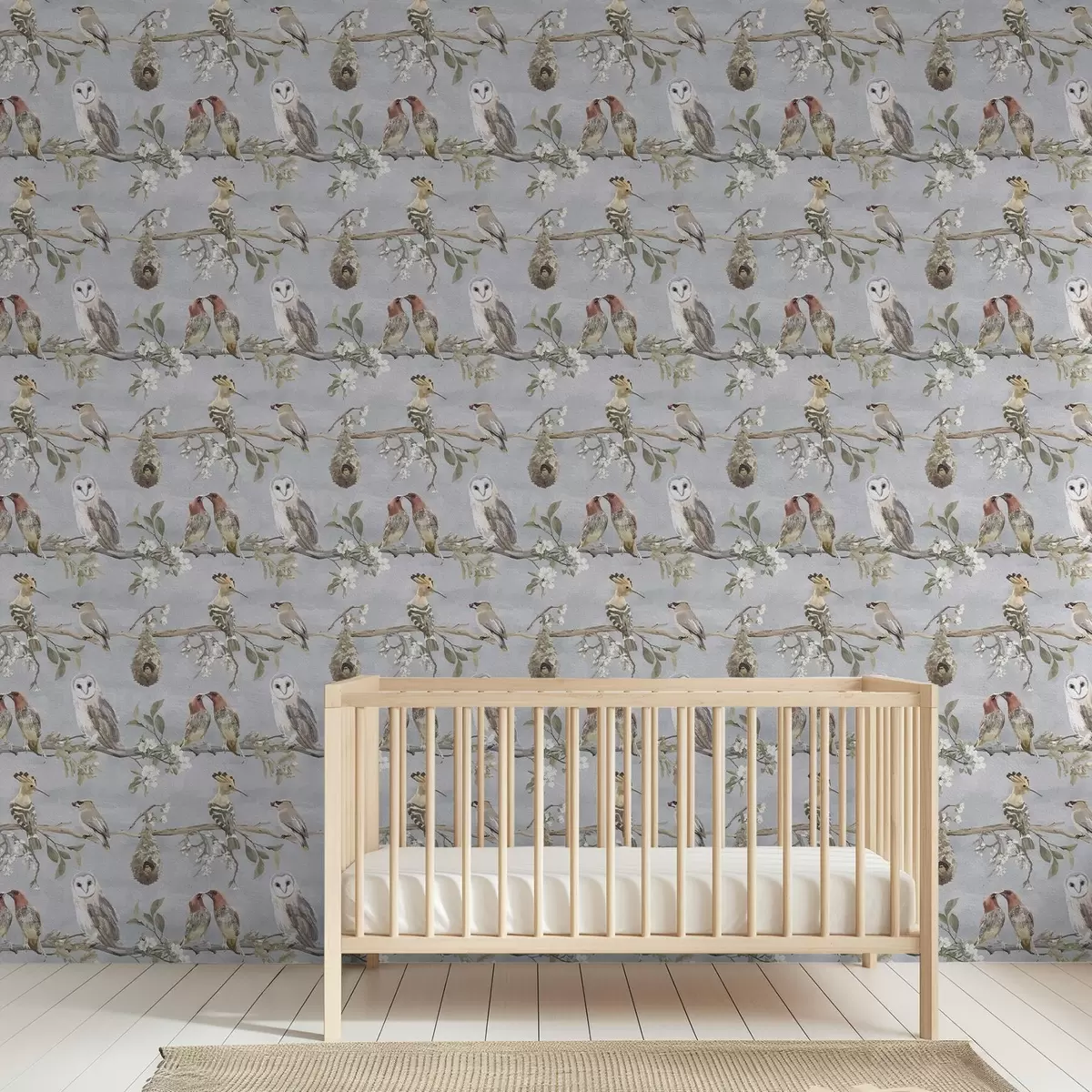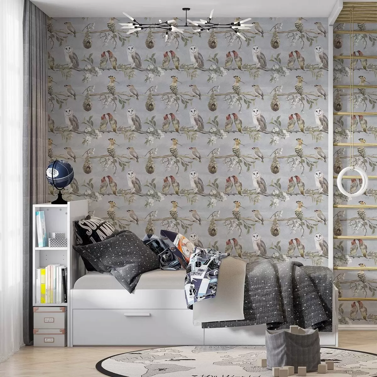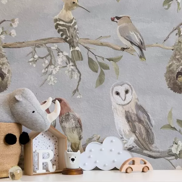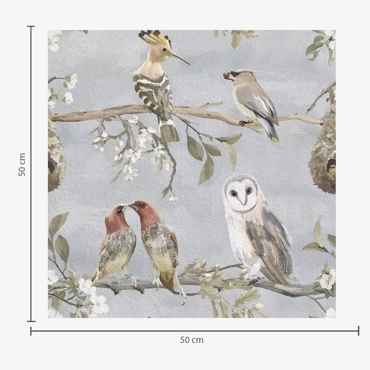 Tapeta Ptáci na větvích s květinami na šedém pozadí Nr. a00738