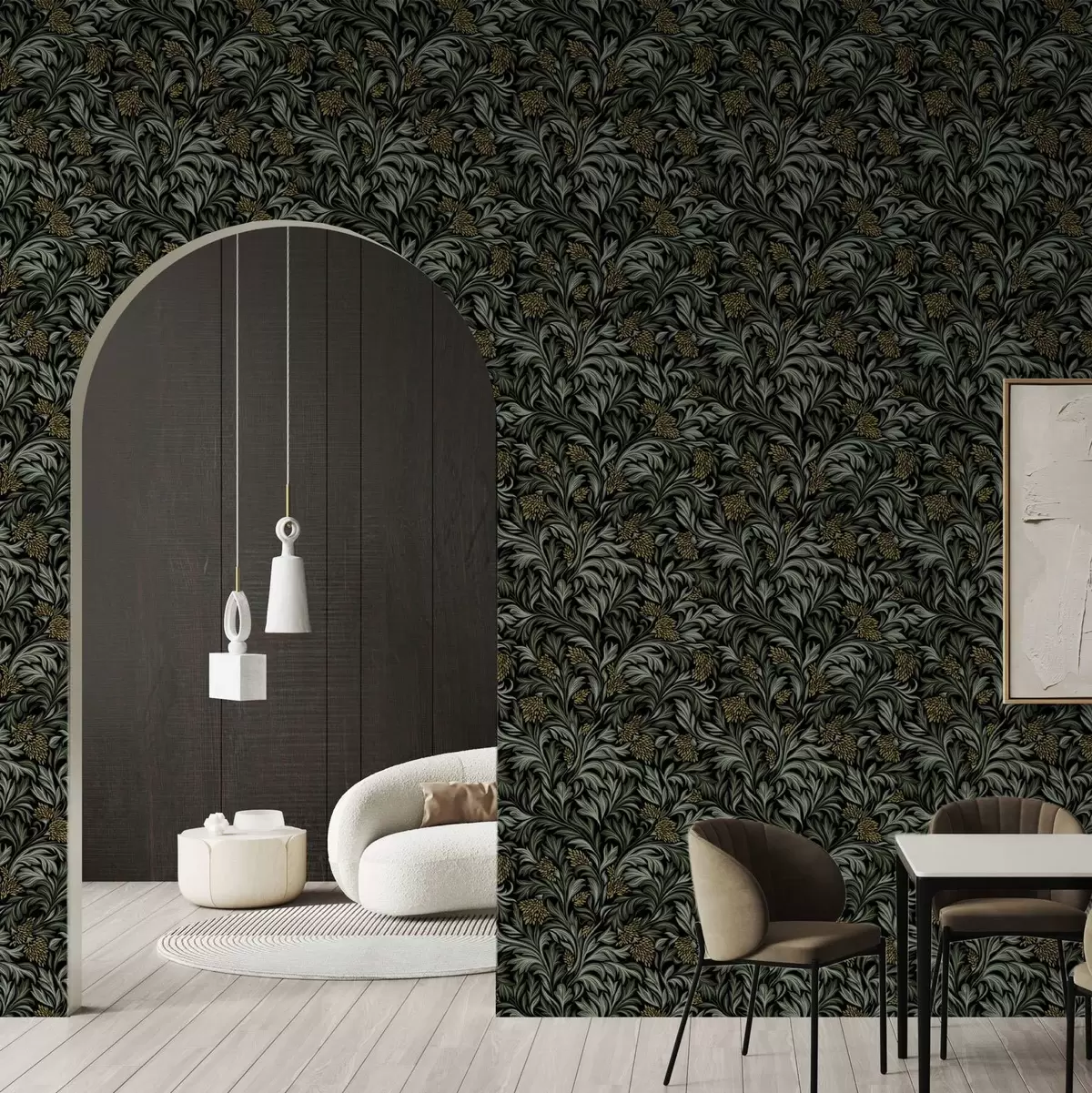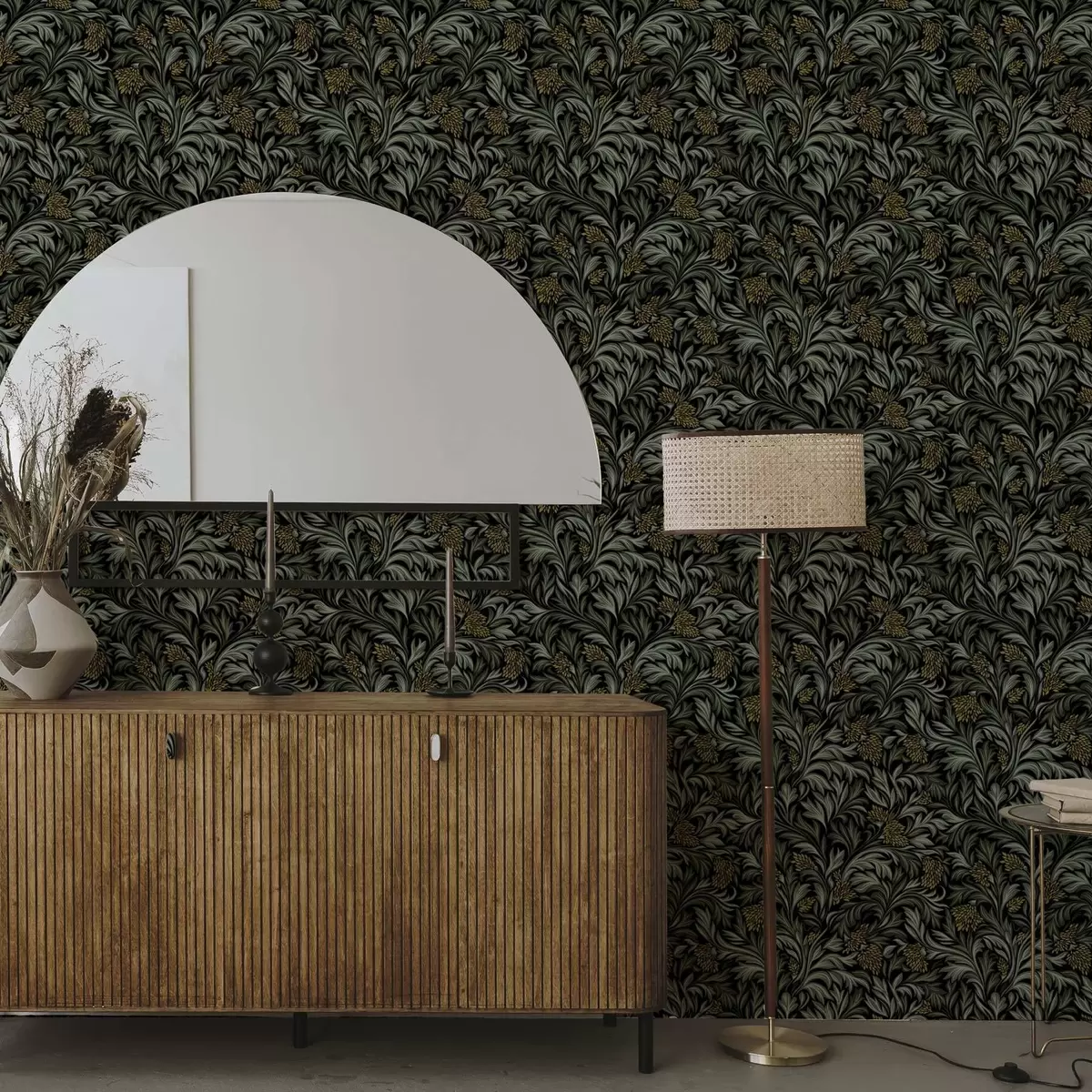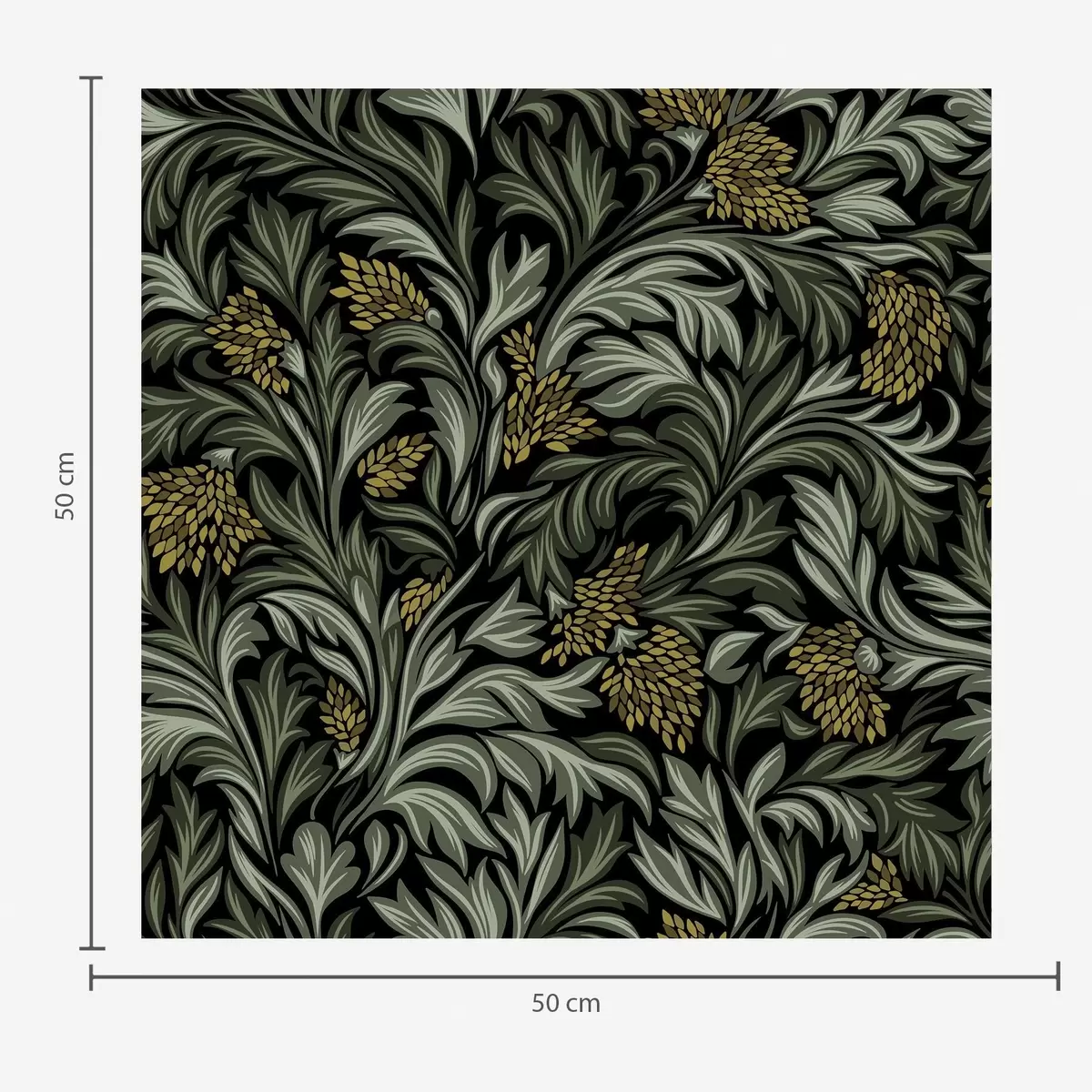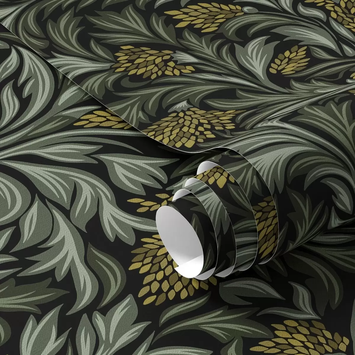 Tapeta Tmavé listy akantu se žlutými šiškami na černém pozadí Nr. a00745