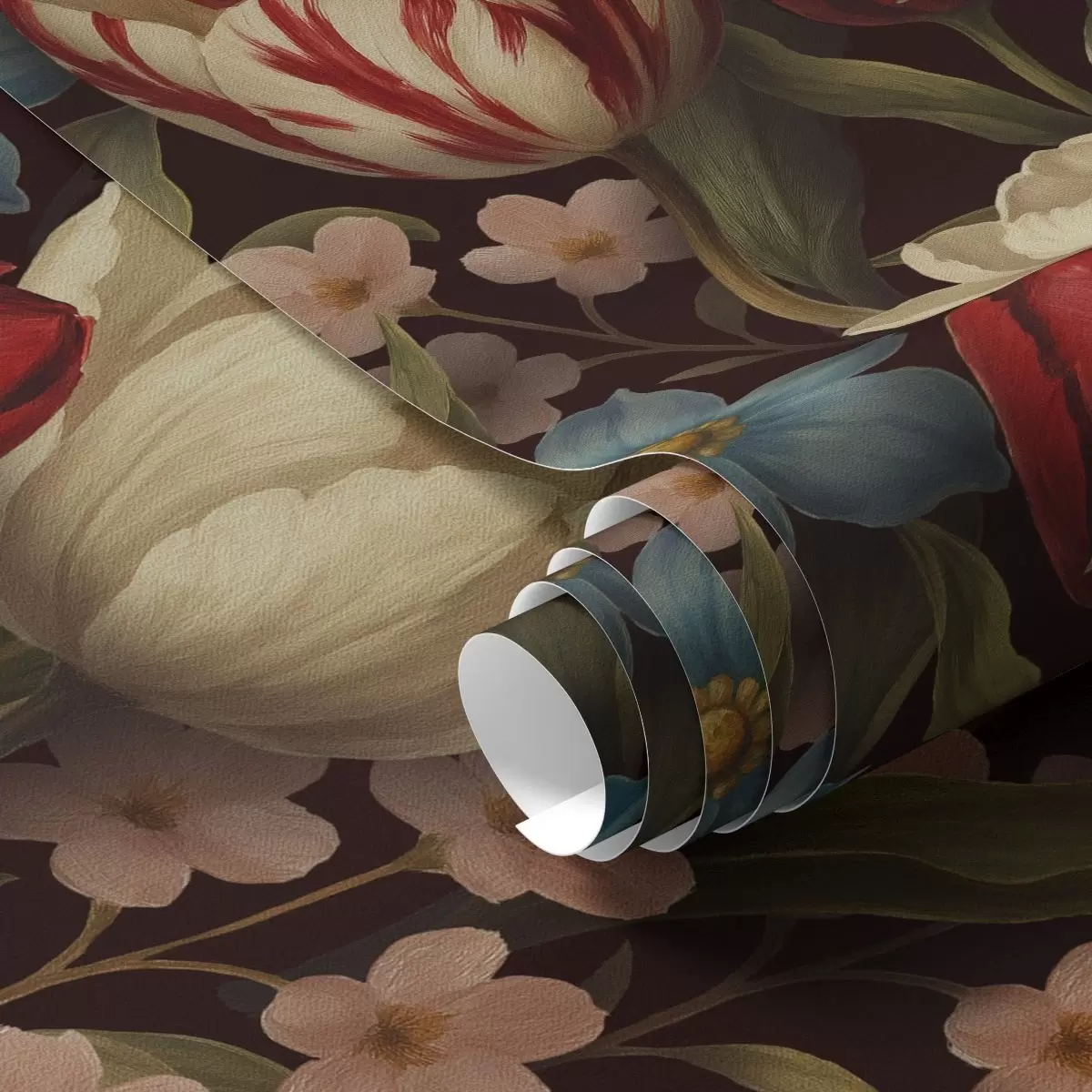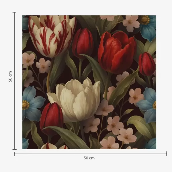 Tapeta Zářivé tulipány a modré květy na tmavém pozadí Nr. a00746