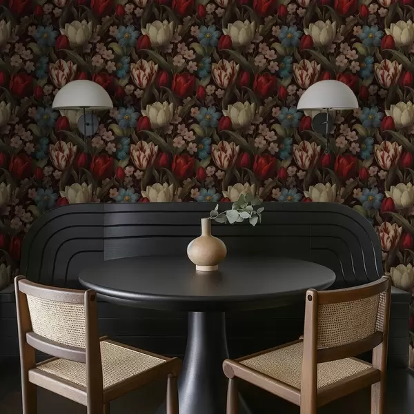 Tapeta Zářivé tulipány a modré květy na tmavém pozadí Nr. a00746