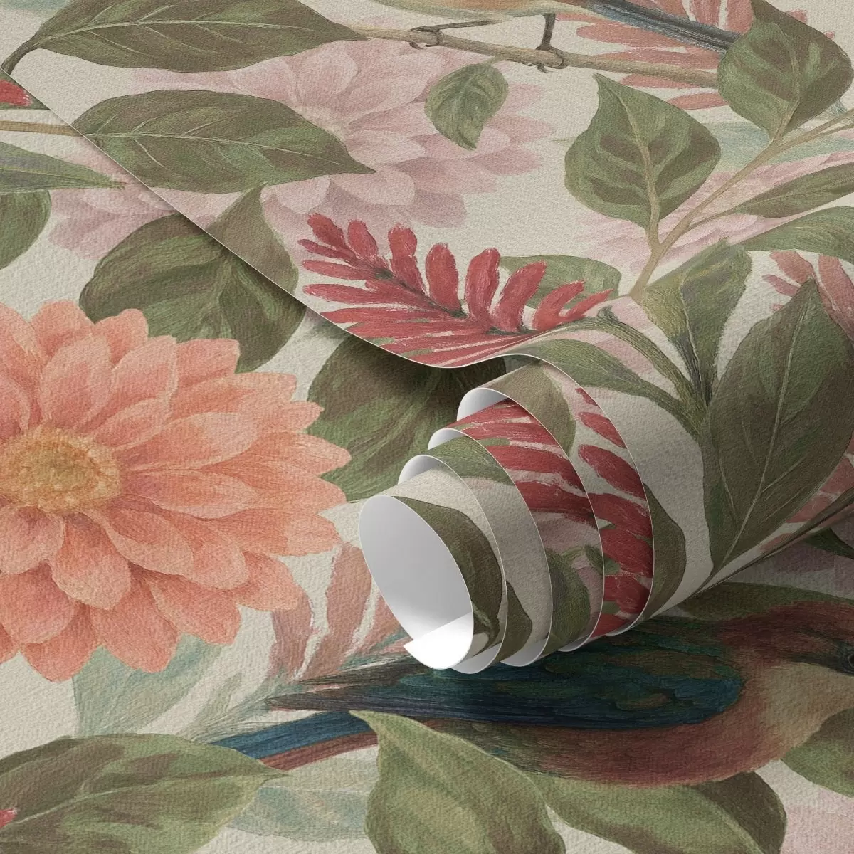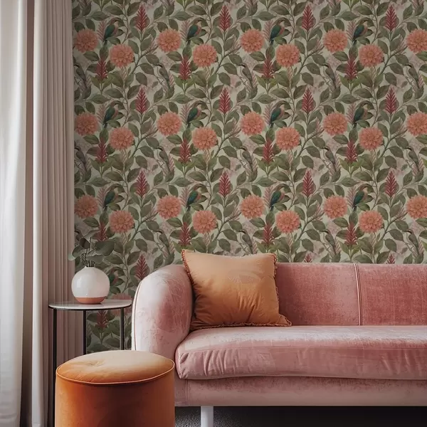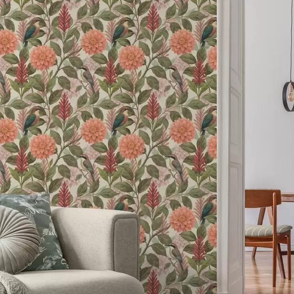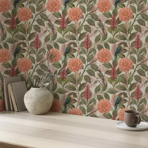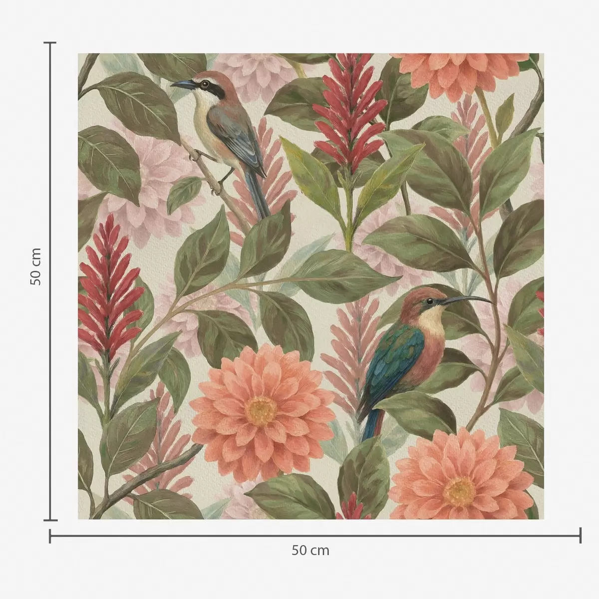 Tapeta Ptáci mezi květinami a listy v teplých tónech Nr. a00753