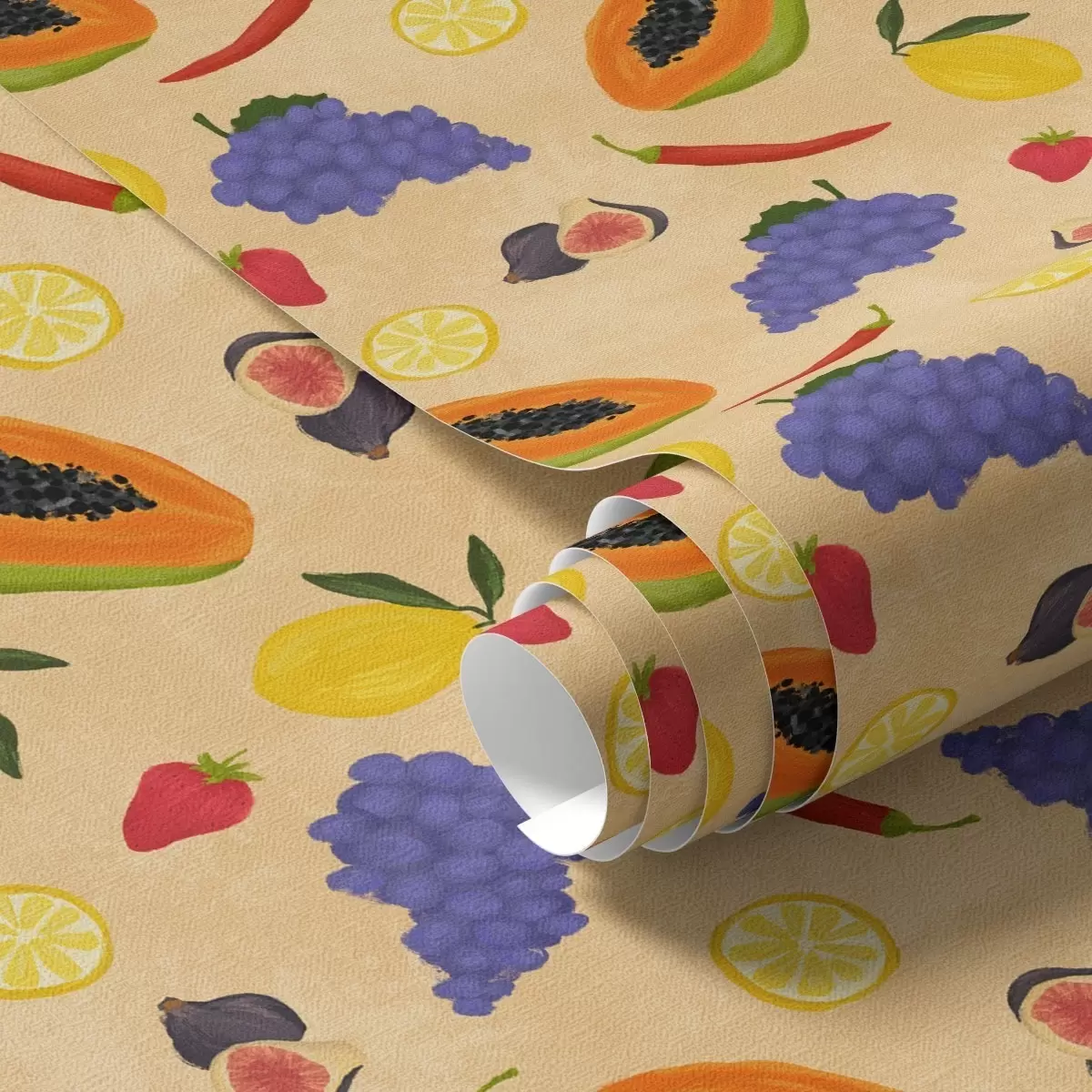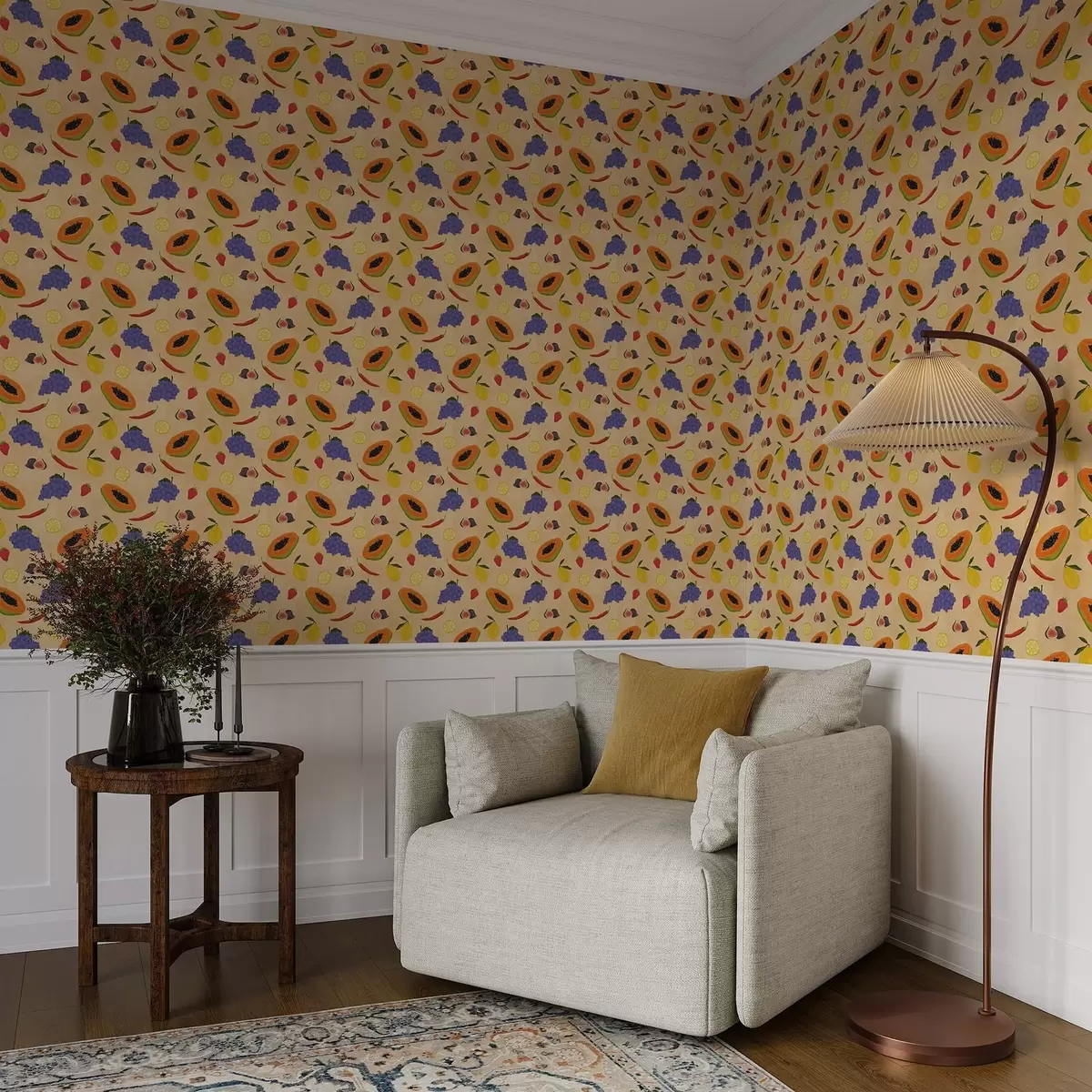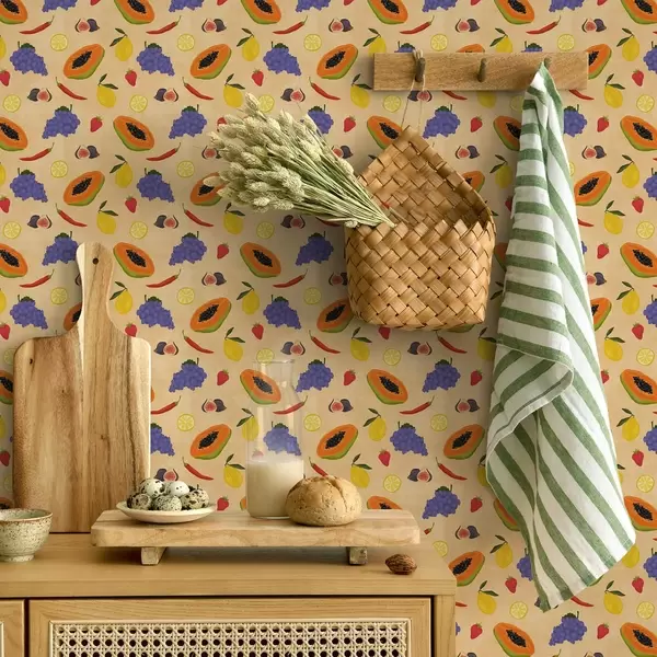 Tapeta Papája, citrusové plody a bobule na bohatém teplém pozadí Nr. a00803v1