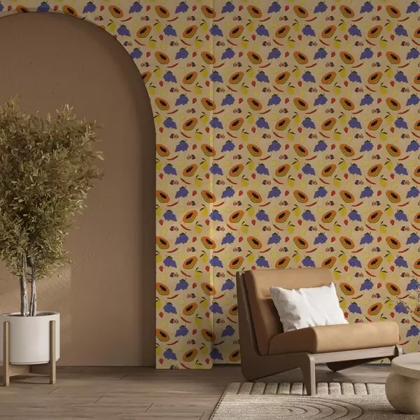 Tapeta Papája, citrusové plody a bobule na bohatém teplém pozadí Nr. a00803v1