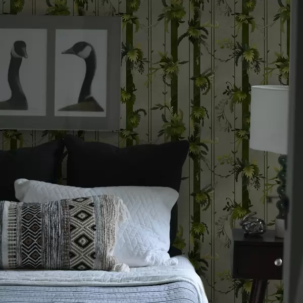 Tapeta Zelené listy ve svislých pruzích na šedém pozadí Nr. a00807v1