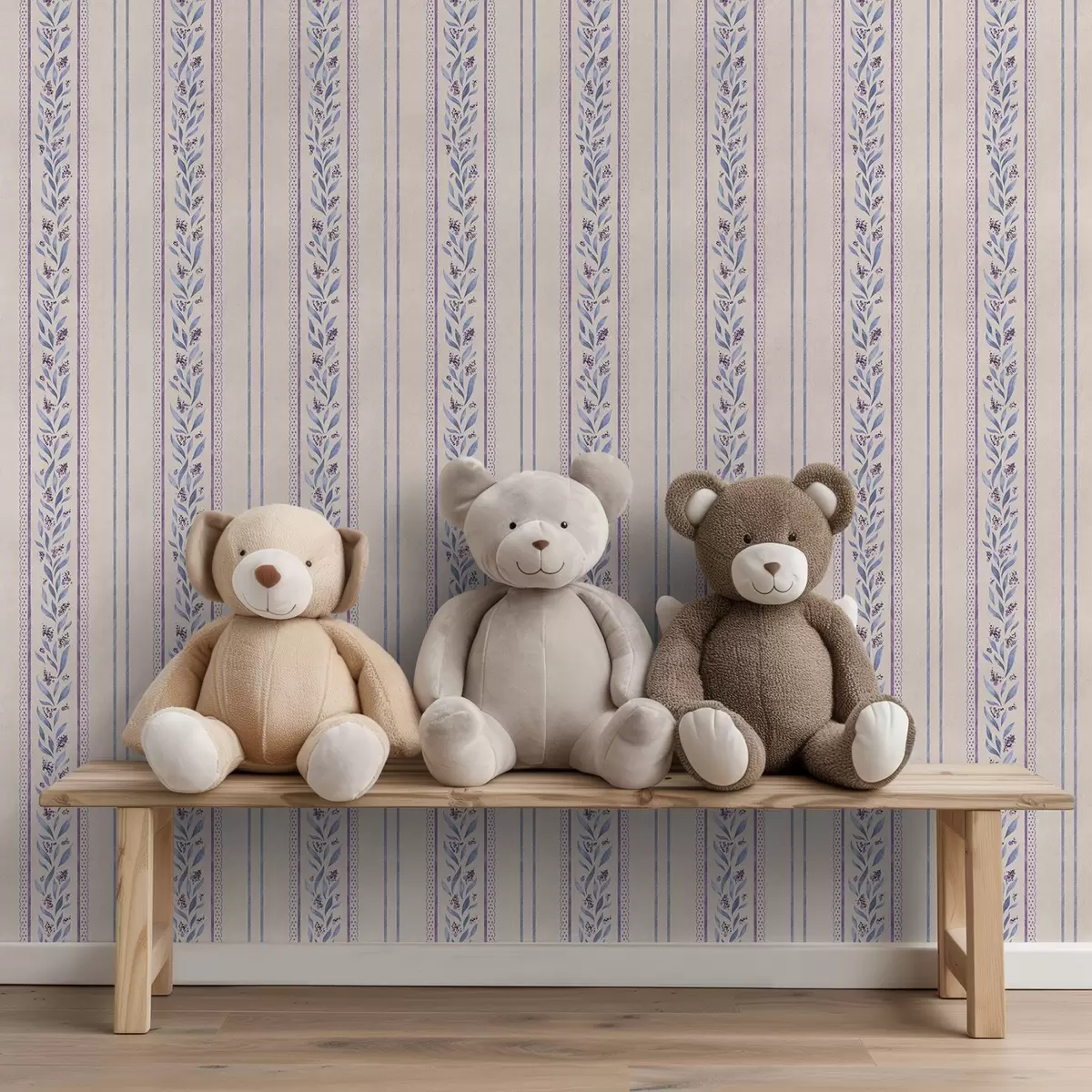 Tapeta Svislé pruhy s levandulovými vinětami, teplá béžová Nr. a00813