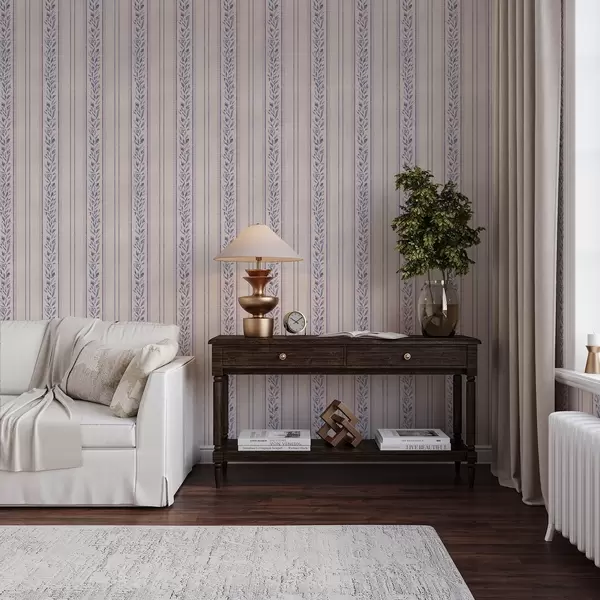 Tapeta Svislé pruhy s levandulovými vinětami, teplá béžová Nr. a00813