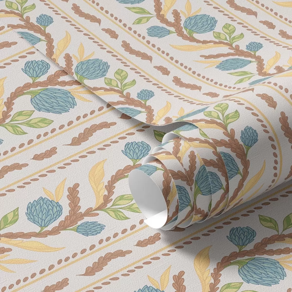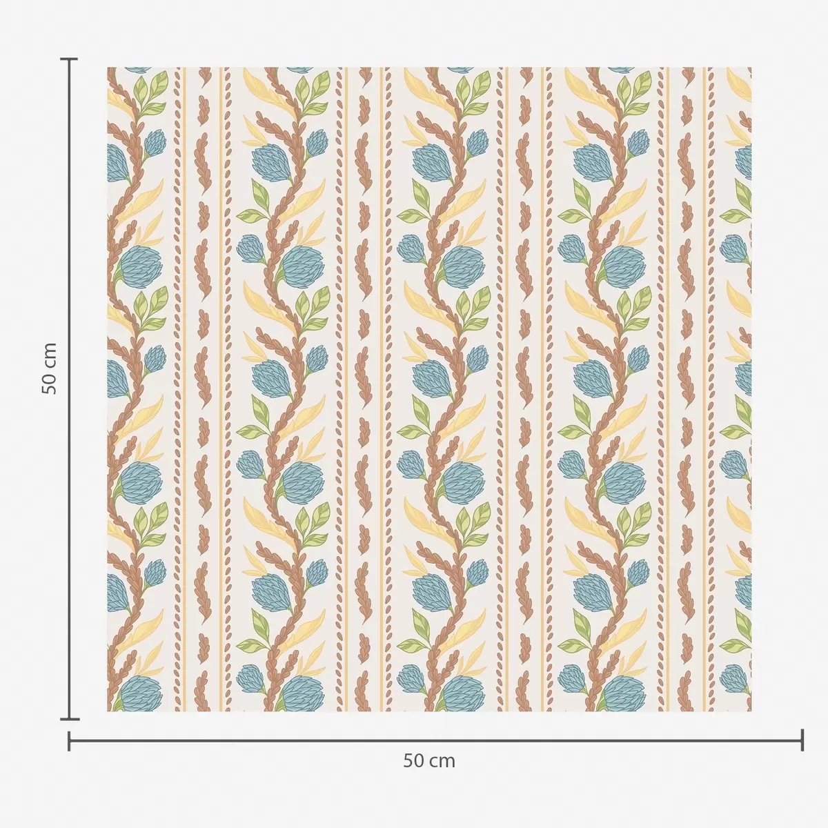 Tapeta Vertikální pruhy s modrými květinami na teplém pozadí Nr. a00816v3