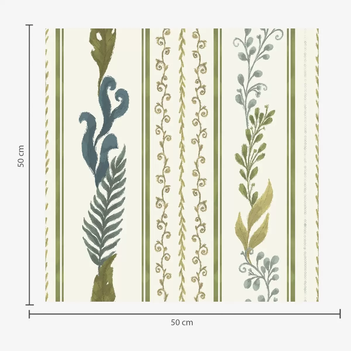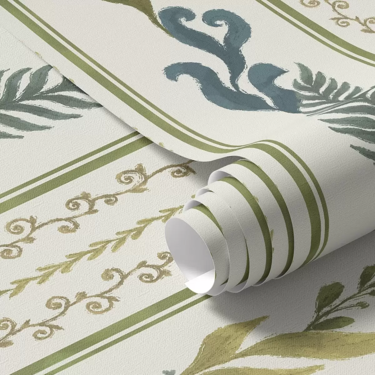 Tapeta Pruhy se spirálovým ornamentem a velkými větvemi v zelených barvách Nr. a00823