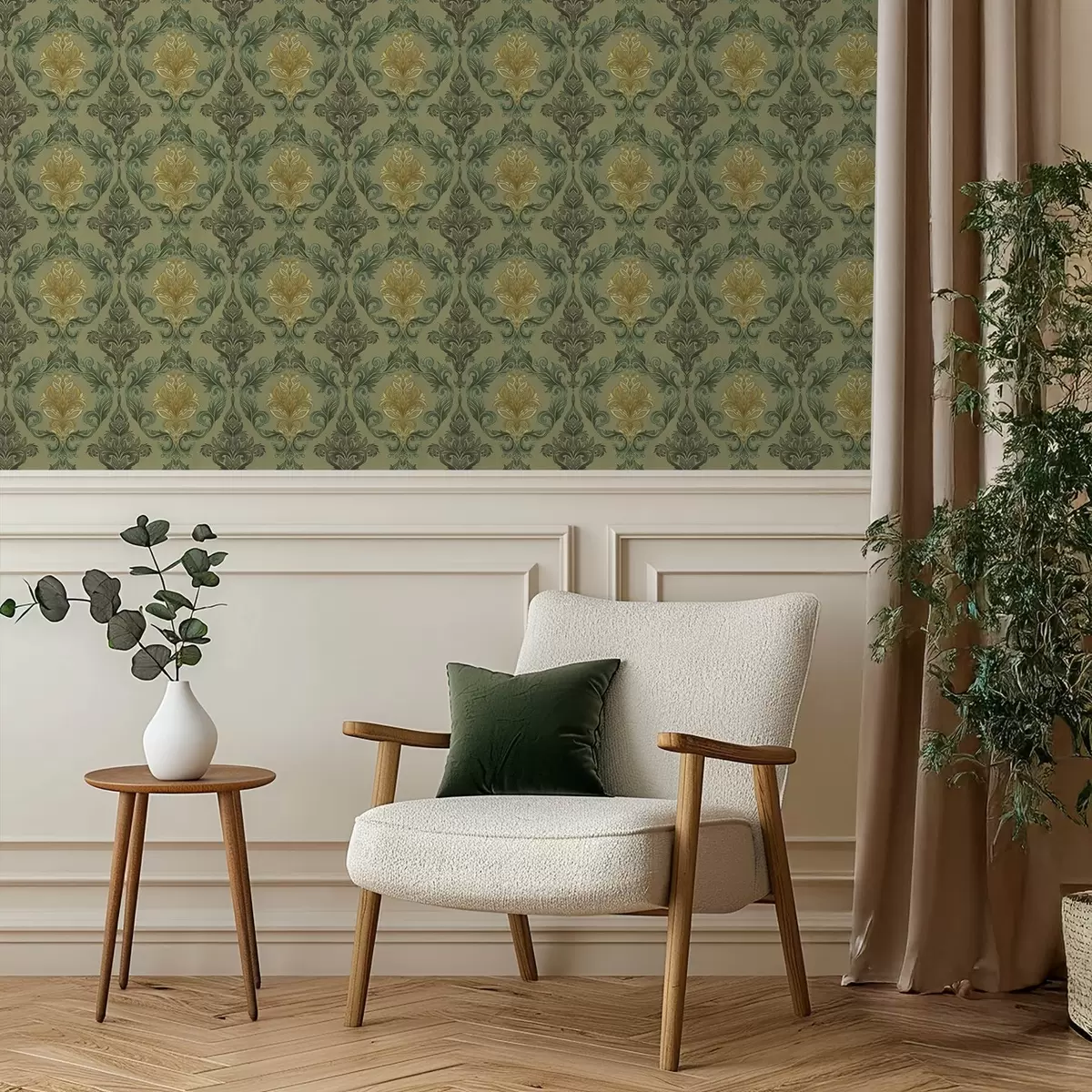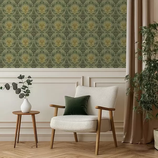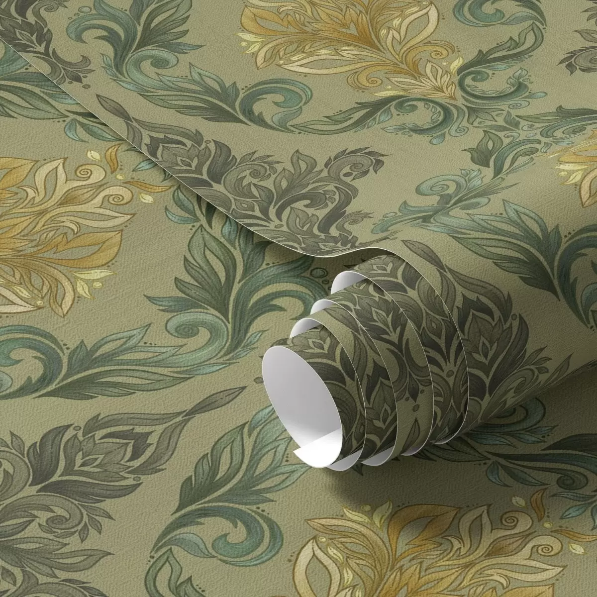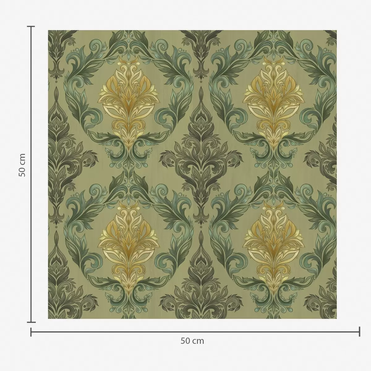 Tapeta Damašek s rostlinnými ornamenty, olivově okrová paleta Nr. a00828