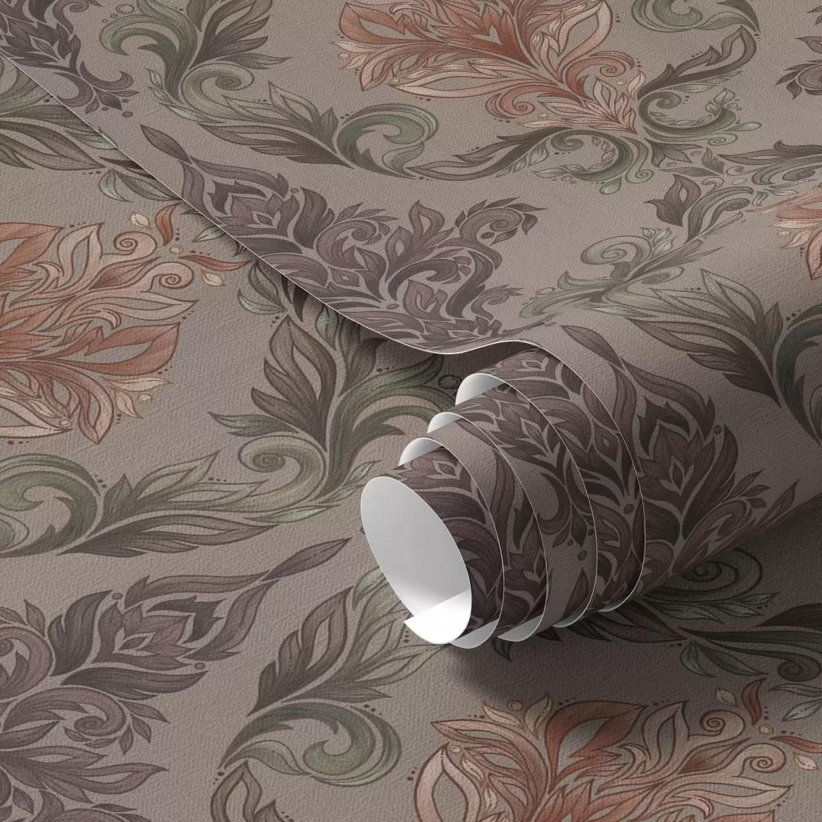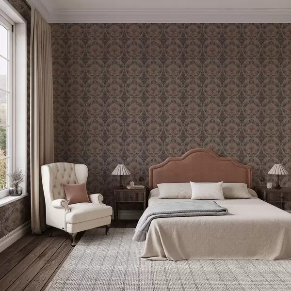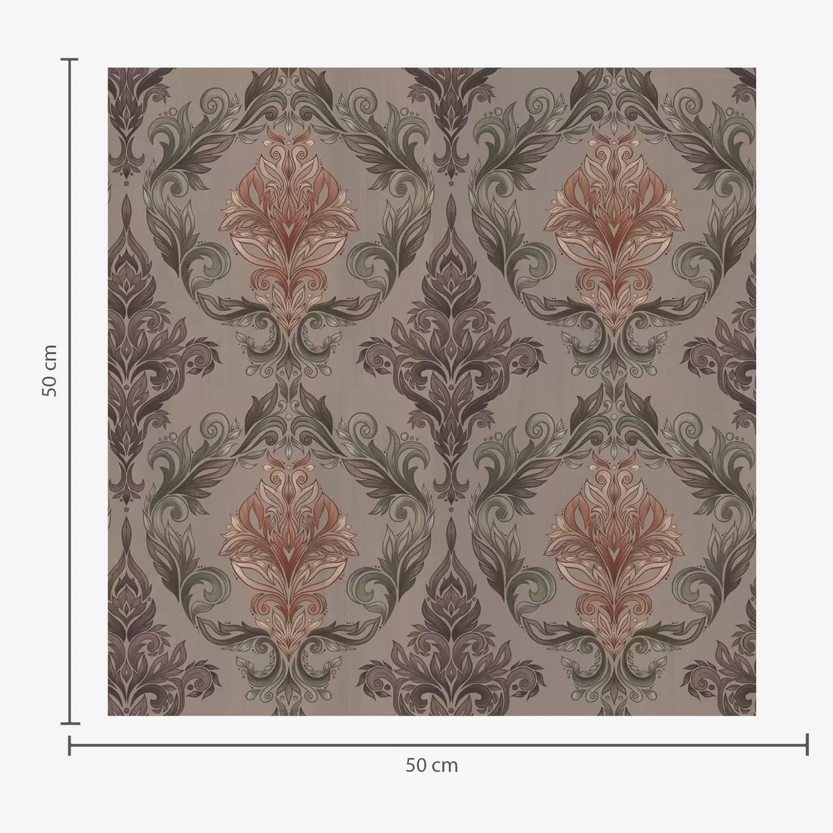 Tapeta Damašek v hnědé a terakotové barevné paletě, teplé šedé pozadí Nr. a00828v2