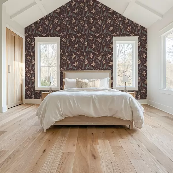Tapeta Krémové květy se šedými listy na vínovém pozadí Nr. a00833