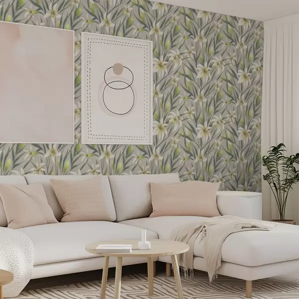 Tapeta Krémové lilie s listy na šedobéžovém pozadí Nr. a00837