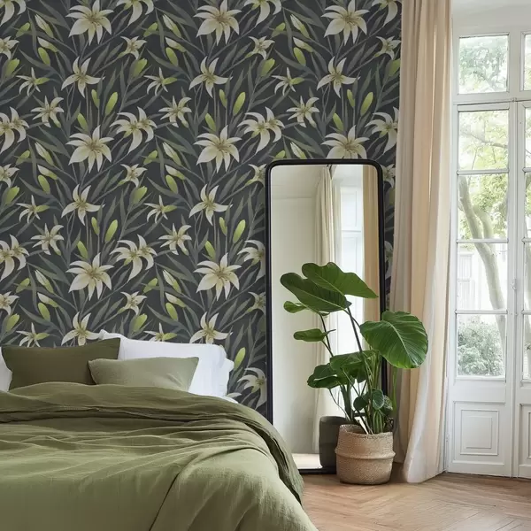 Tapeta Krémové lilie s listy na tmavém pozadí Nr. a00837v1