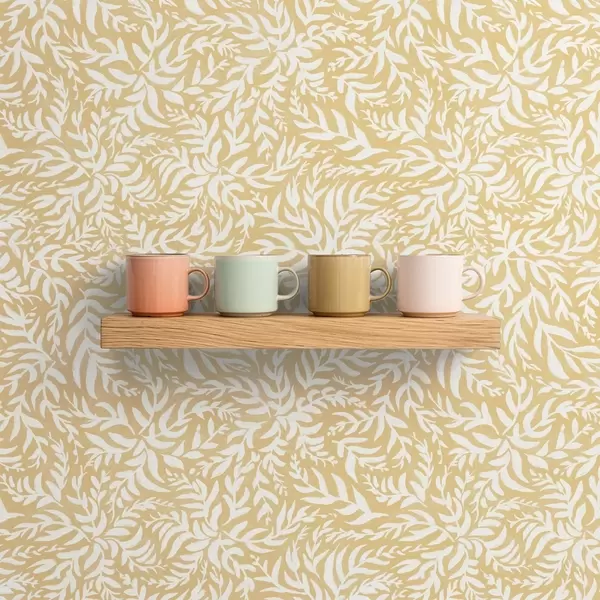 Tapeta Bílý listový vzor na teplé okrové barvě, vířící rytmus Nr. a00845